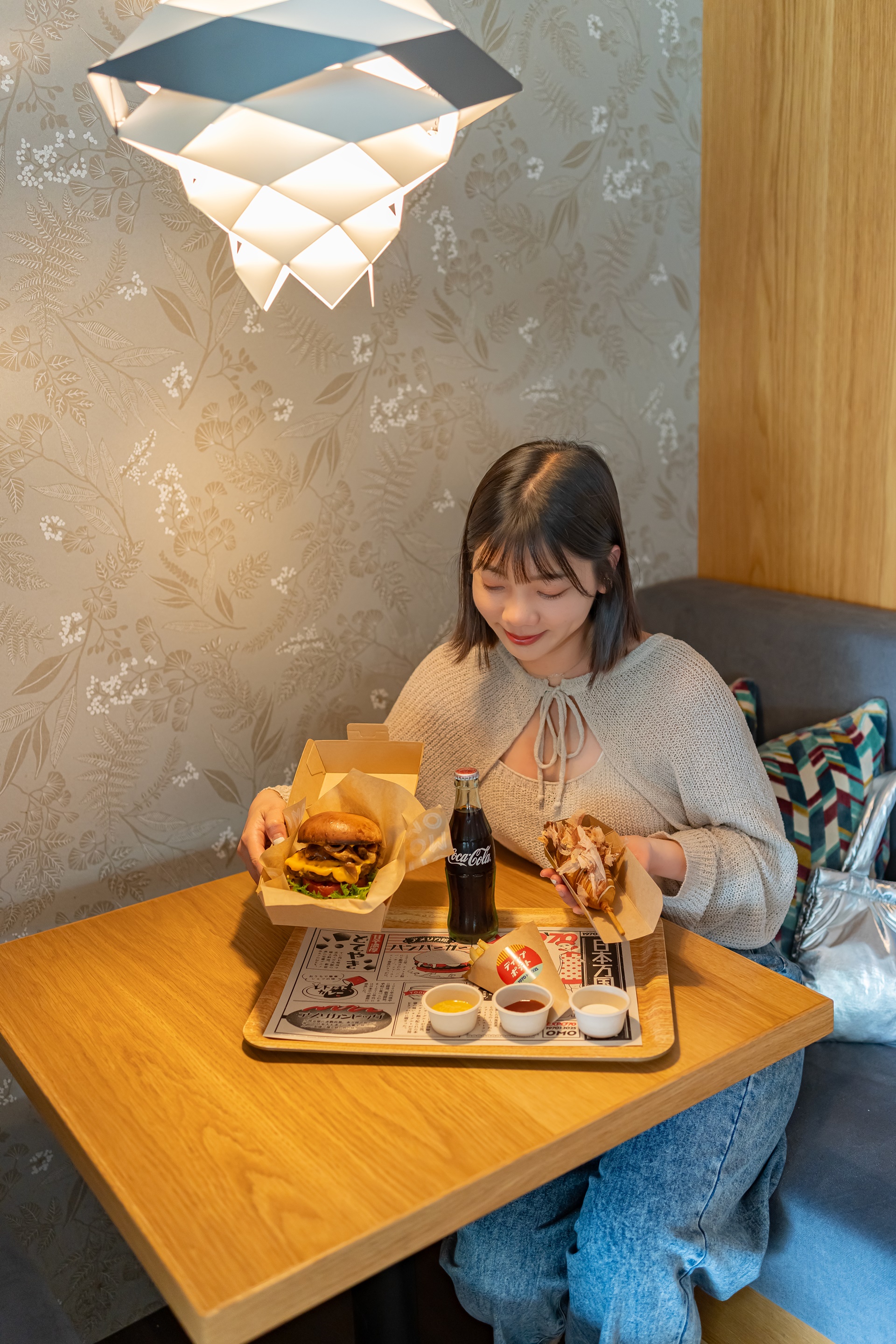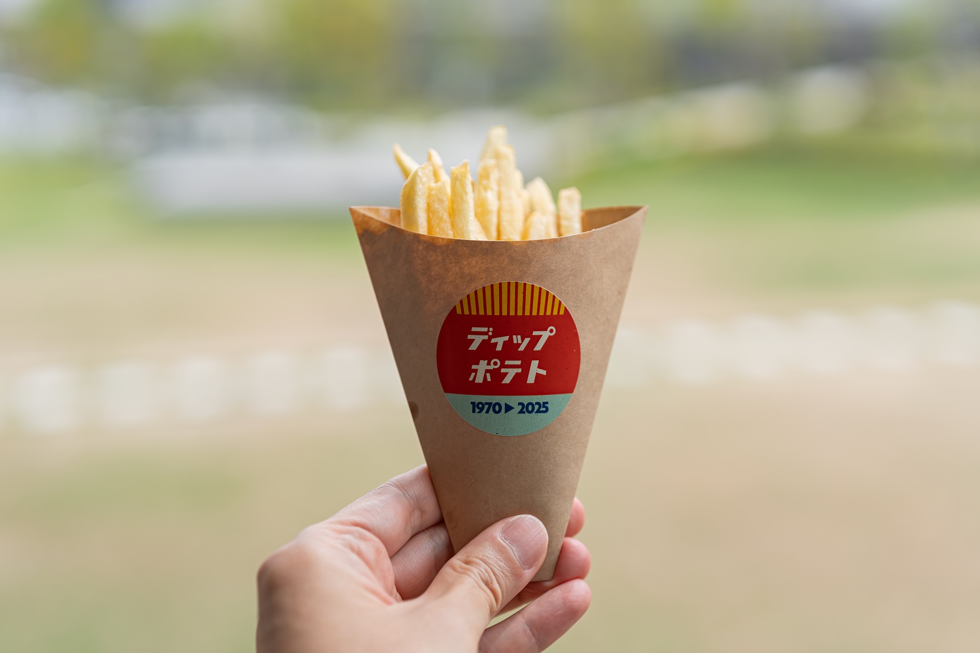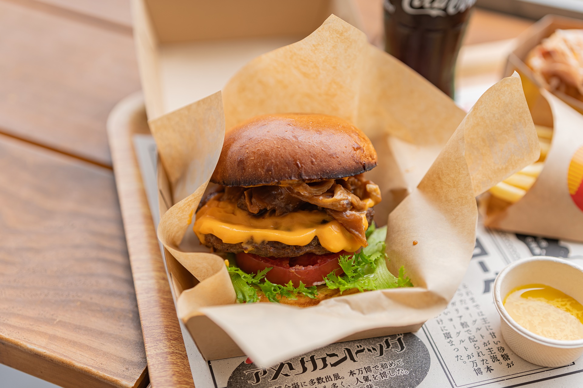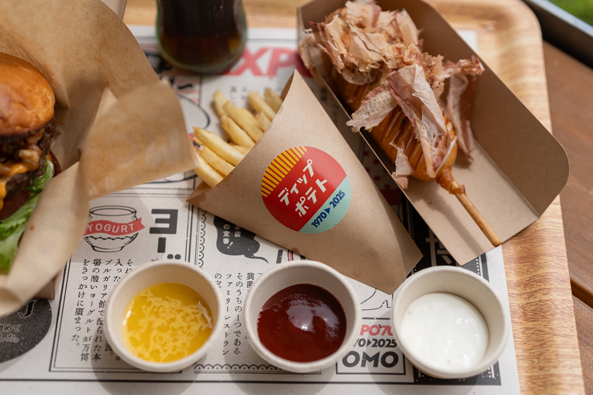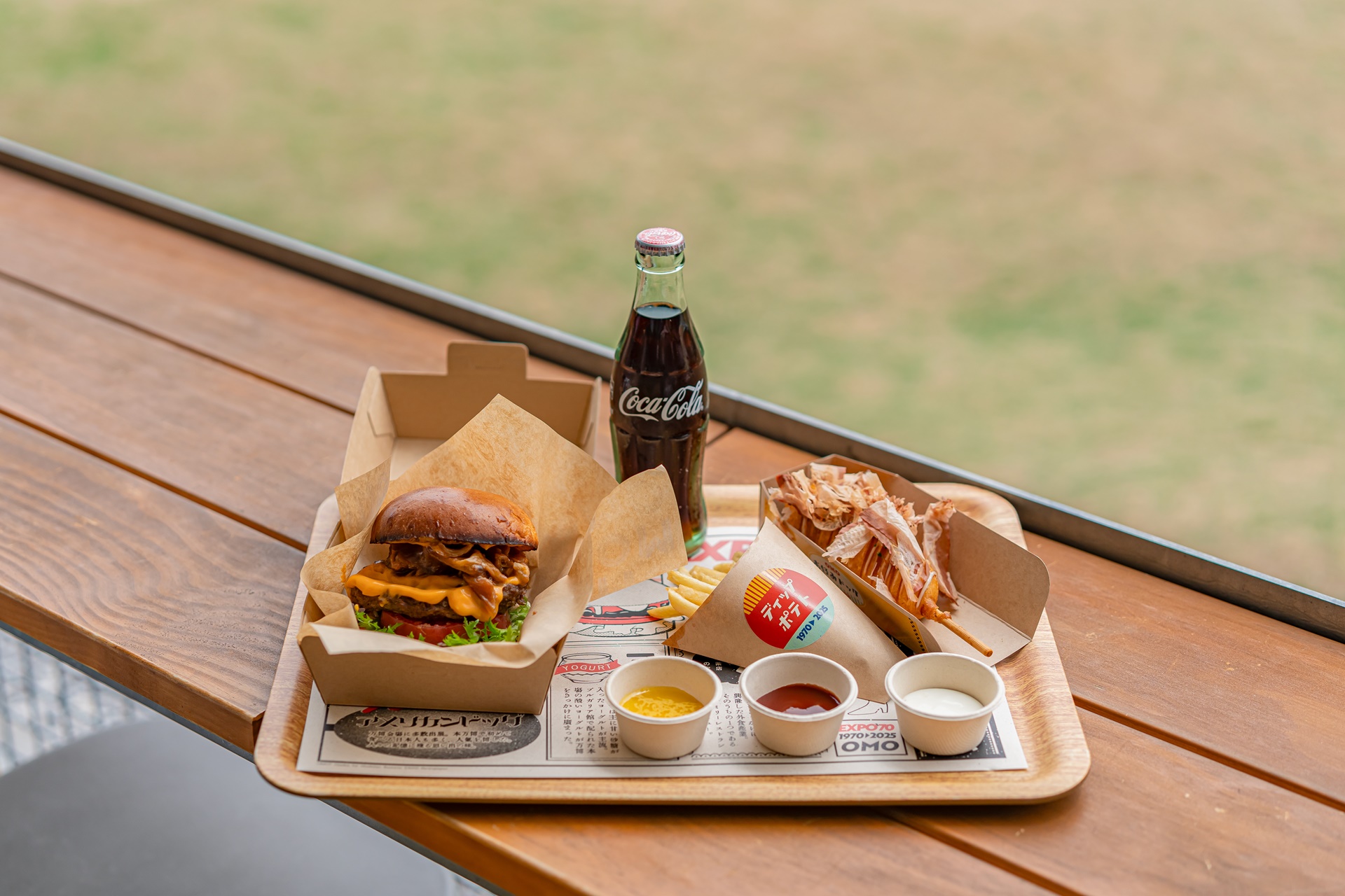 햄버거 패티 위에 오사카 명물인 도테야키를 올려 오사카다움을 느낄 수 있는 메뉴입니다. 세트로 구매하면, 당시의 양식 문화를 떠올리게 하는 '나폴리탄' 등 디핑 소스 3종과 함께 감자 튀김이 제공 됩니다. 과거 오사카 엑스포 때 유행한 병 콜라도 함께 제공합니다.