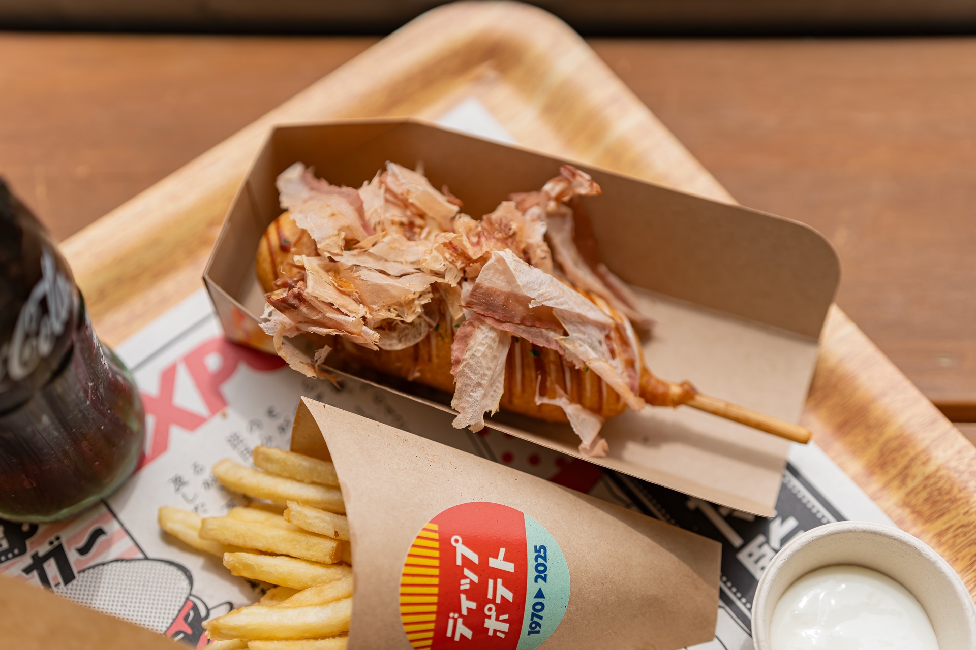 1970년 당시 큰 인기를 끌었던 콘 도그에 가쓰오부시 등을 토핑하여 마치 오코노미야키 같은 생김새로 만들었습니다. 오코노미야키 같은 맛과 생김새까지도 즐길 수 있는 맛있는 메뉴입니다.