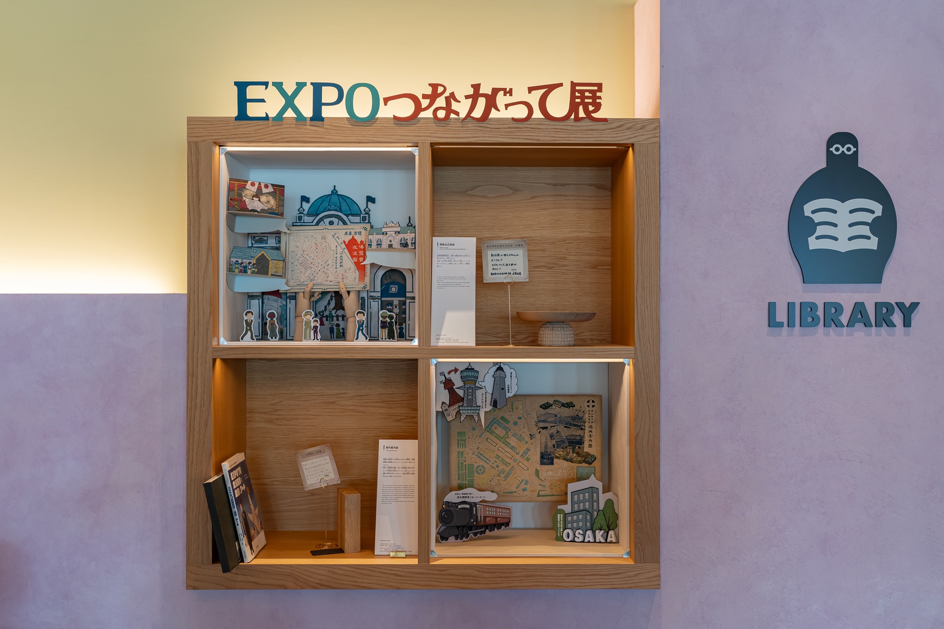 호텔 라이브러리 라운지에서는 122년 전의 소중한 박람회 자료를 미래의 디자이너들이 만든 공간에서 전시합니다. 기존 오사카 박람회와 오사카의 변화들을 알아 볼 수 있습니다.