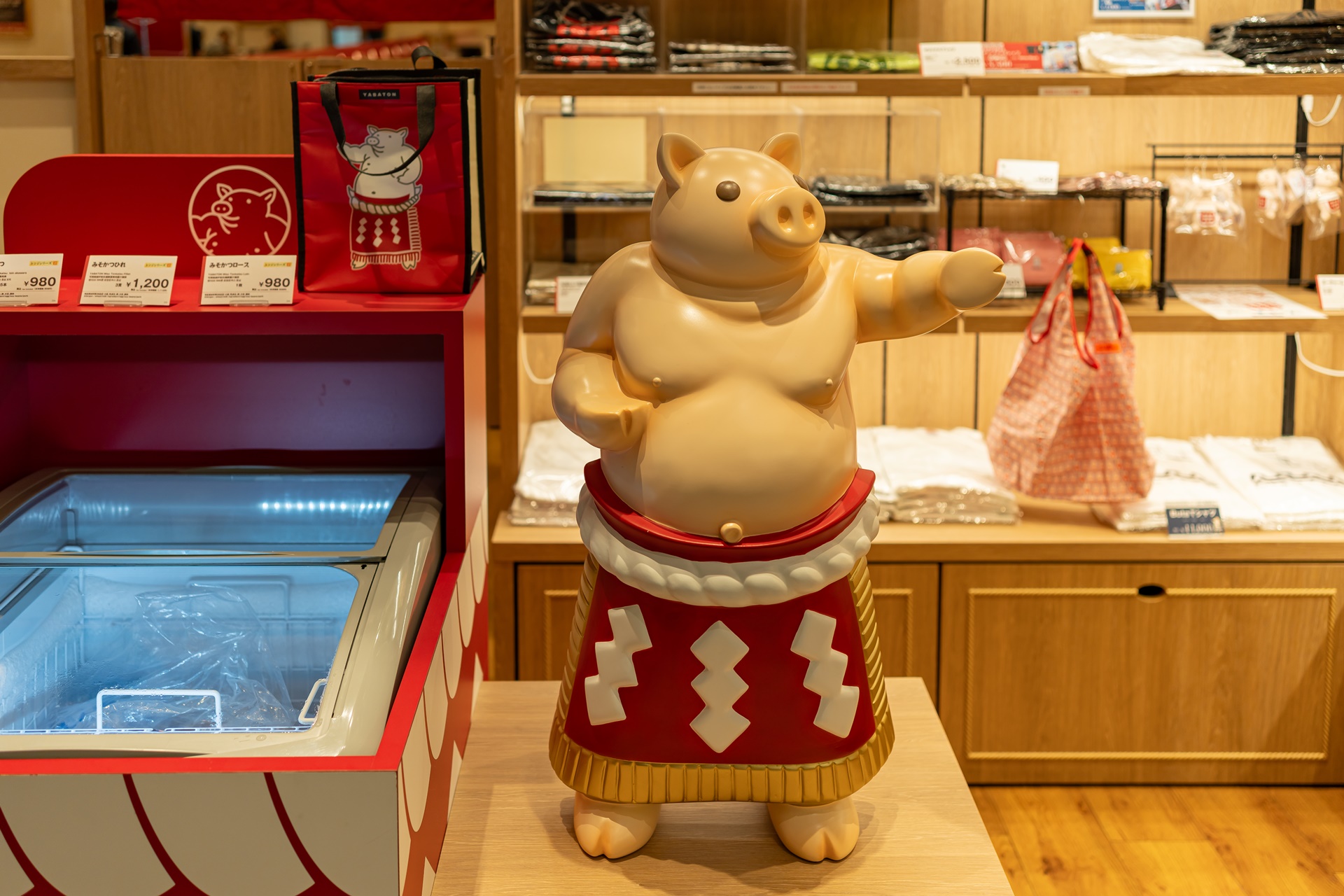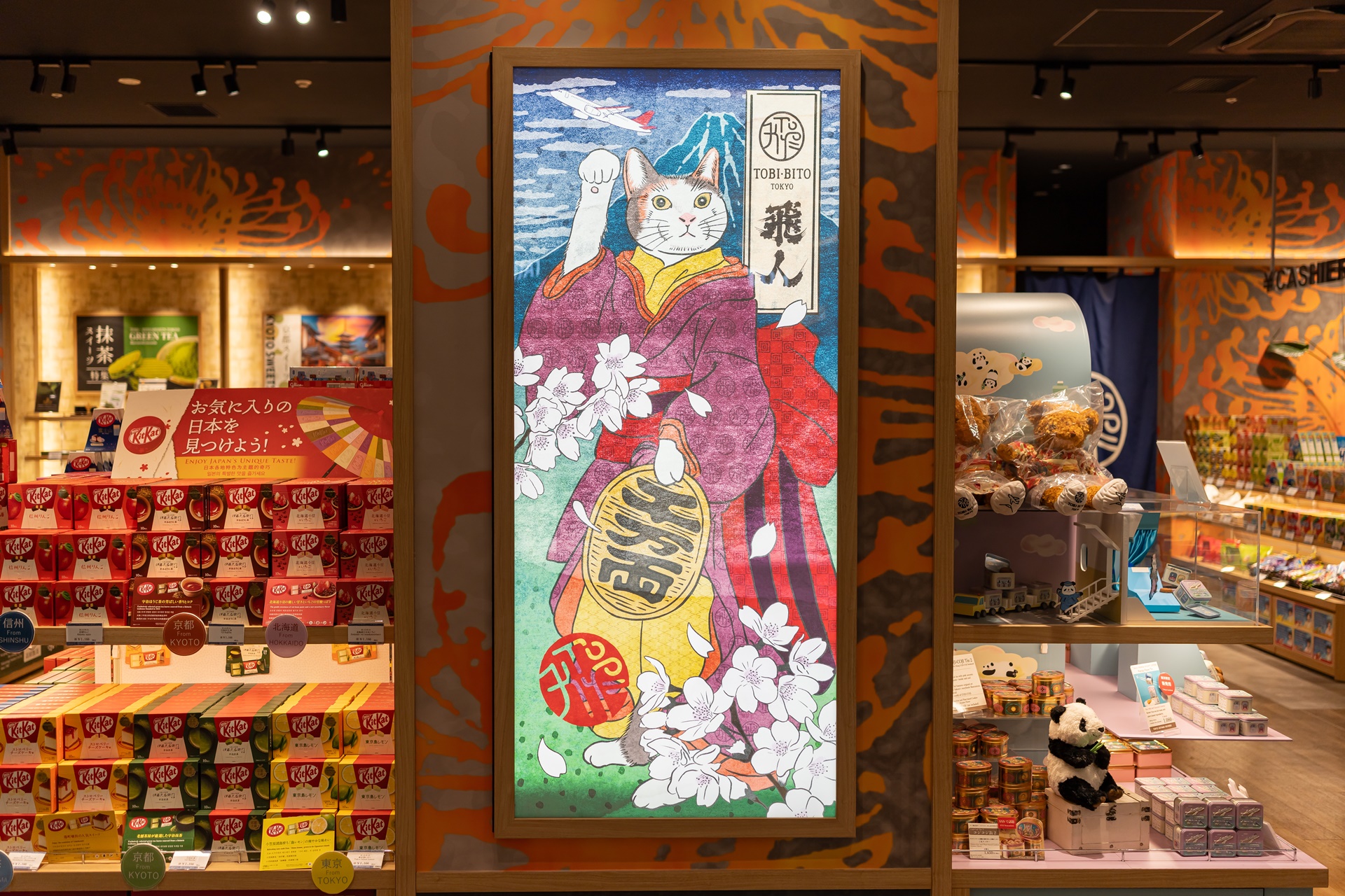 일본 기념품이 가득 진열되어 있는 귀여운 고양이 그림의 기념품 가게