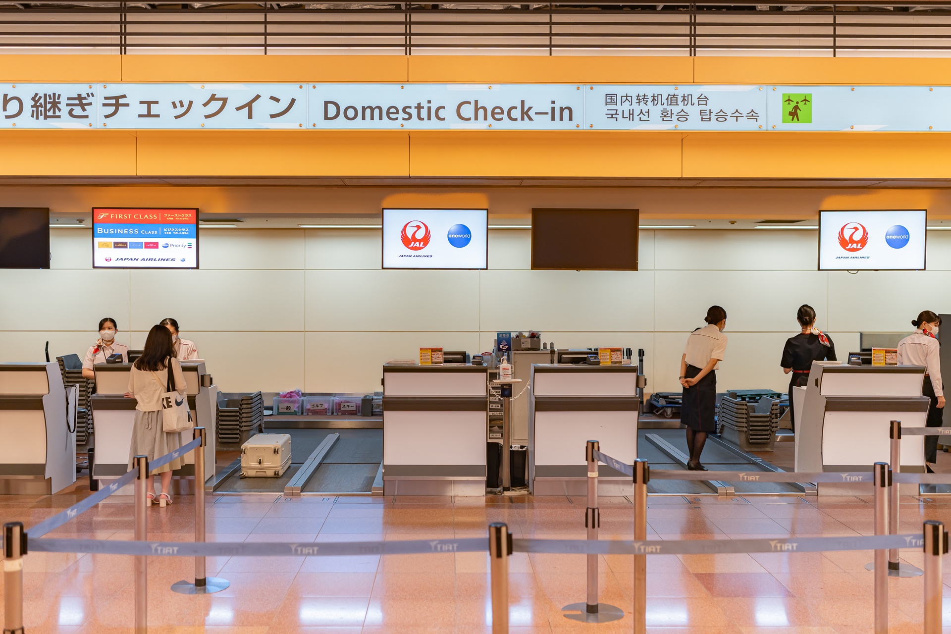 국내선 경유를 위해 하네다 국제선 출구에서 바로 오른쪽에 있는 국내선 환승 탑승 수속 카운터에 짐을 보냅니다.