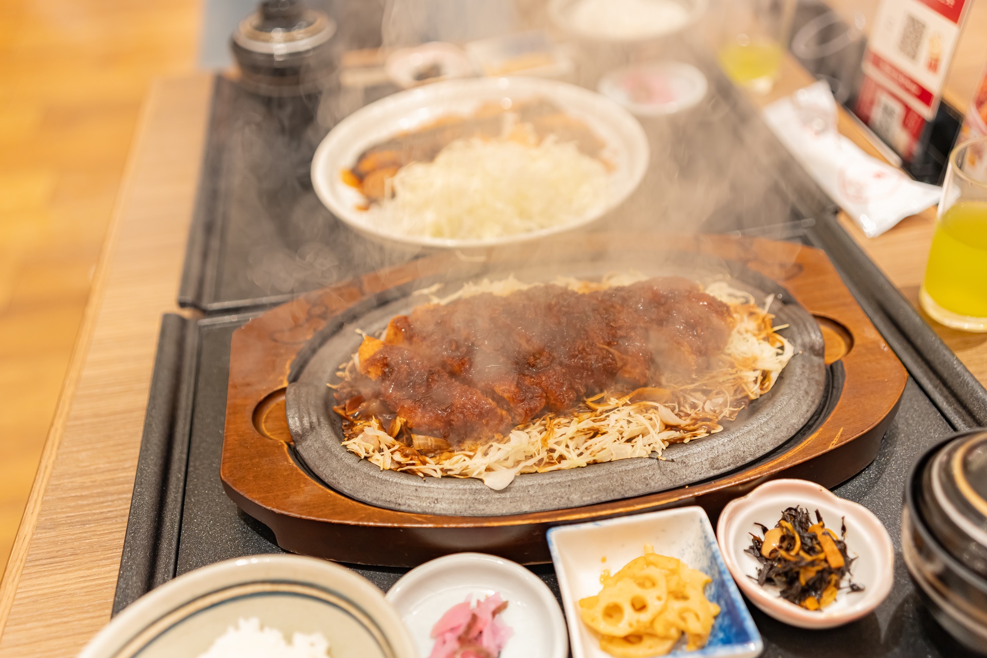 나고야의 된장 소스 돈까스로 철판에 나온 돈까스에 된장 소스를 뿌려 주는 것이 특징입니다.