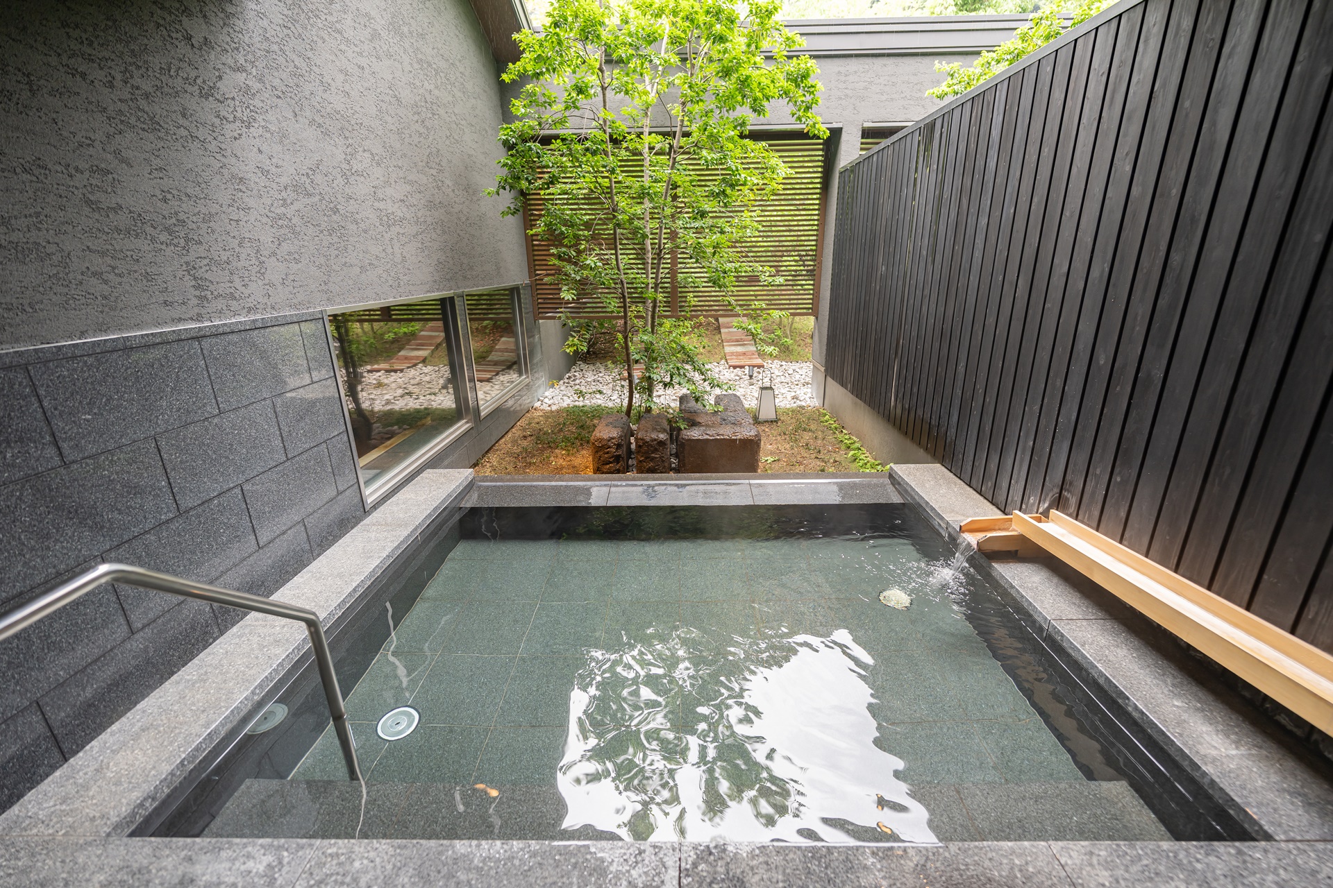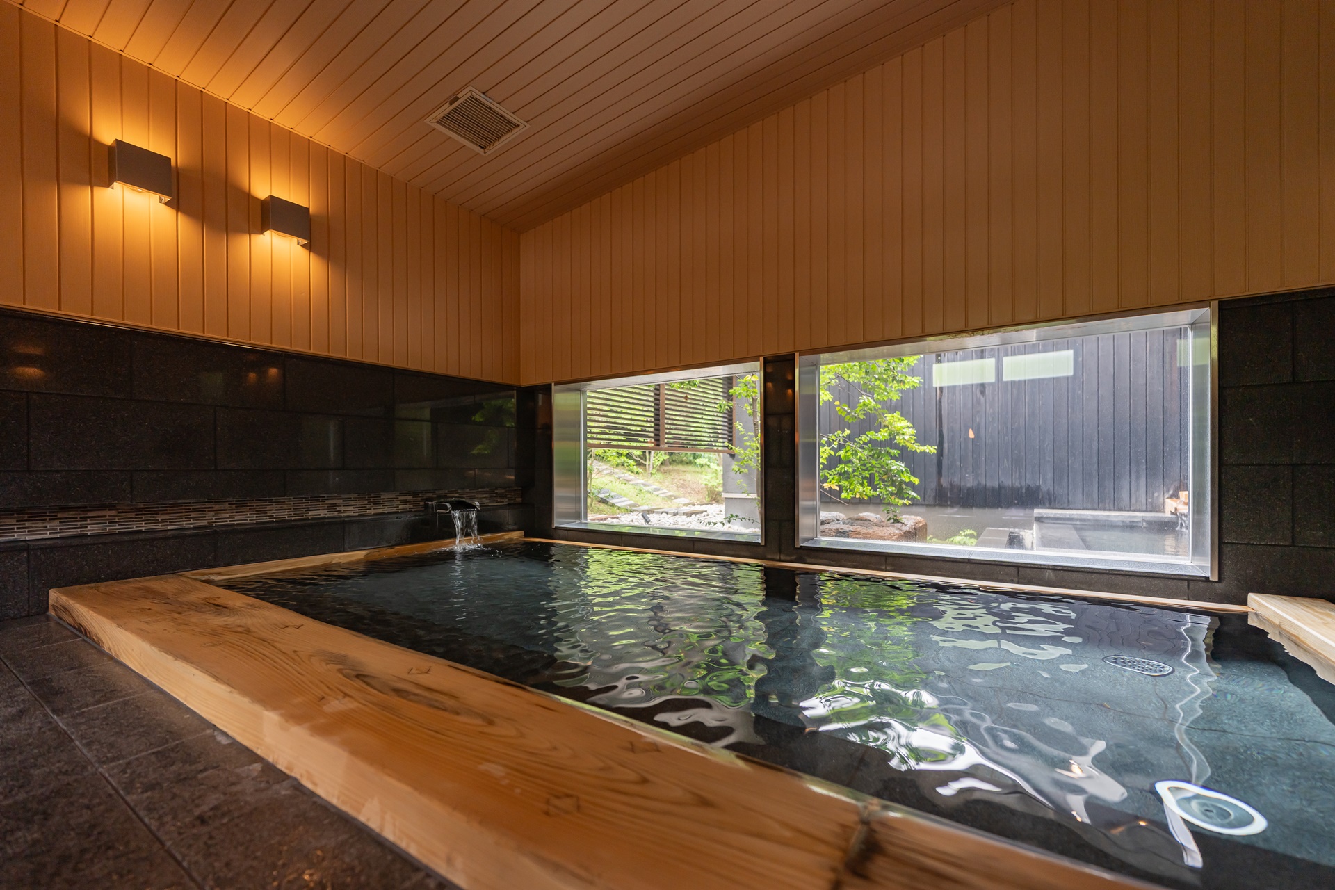 욕실으로 가는 길의 풍경과 온천을 즐기고 휴식을 취할 수 있는 공간