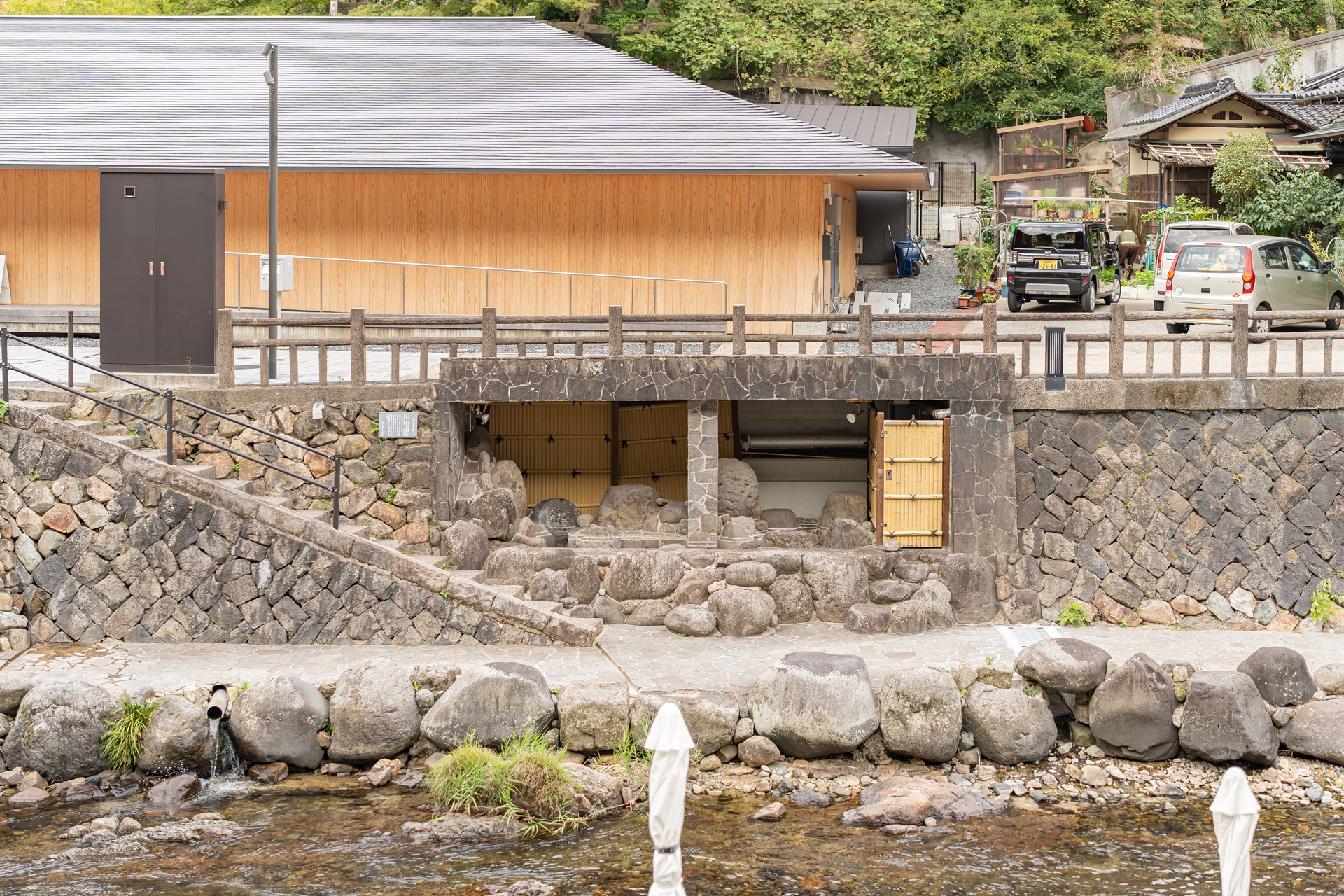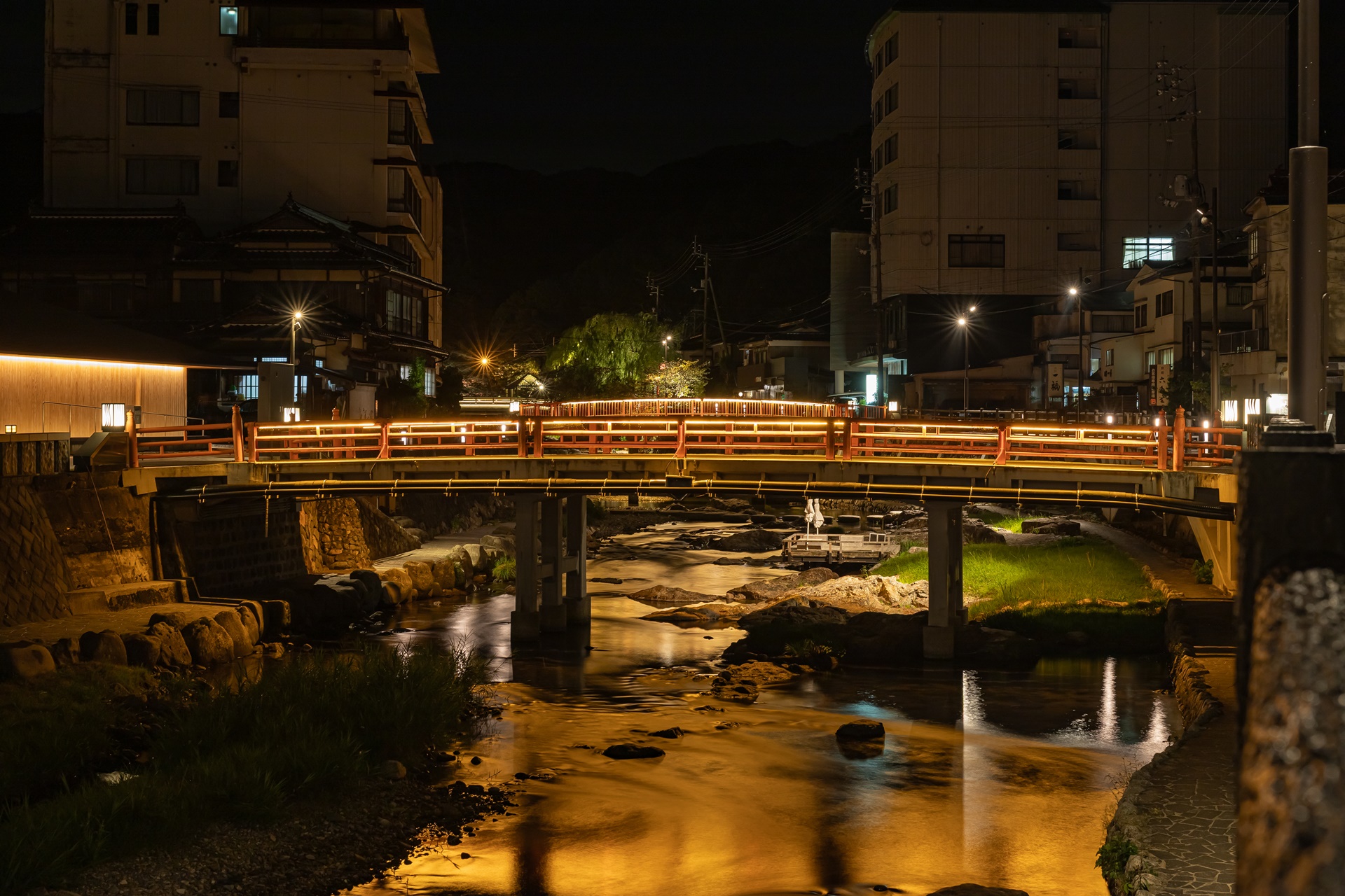 호시노 리조트 카이 나가토 밖으로 나서면 오토즈레 강을 따라 이어진 산책로가 기다리고 있습니다. 길을 걷다 보면 나무 벤치와 족욕탕이 곳곳에 마련되어 있어 잠시 쉬어갈 수 있고, 강 위를 가로지르는 붉은 철교 아야토리바시에 올라서면 온천 마을 전경이 한눈에 들어옵니다. 저녁 무렵, 리조트와 마을 곳곳에 불이 켜지면 물 위로 반사된 조명이 몽환적인 분위기를 자아내, 마치 영화의 한 장면처럼 아름답습니다.