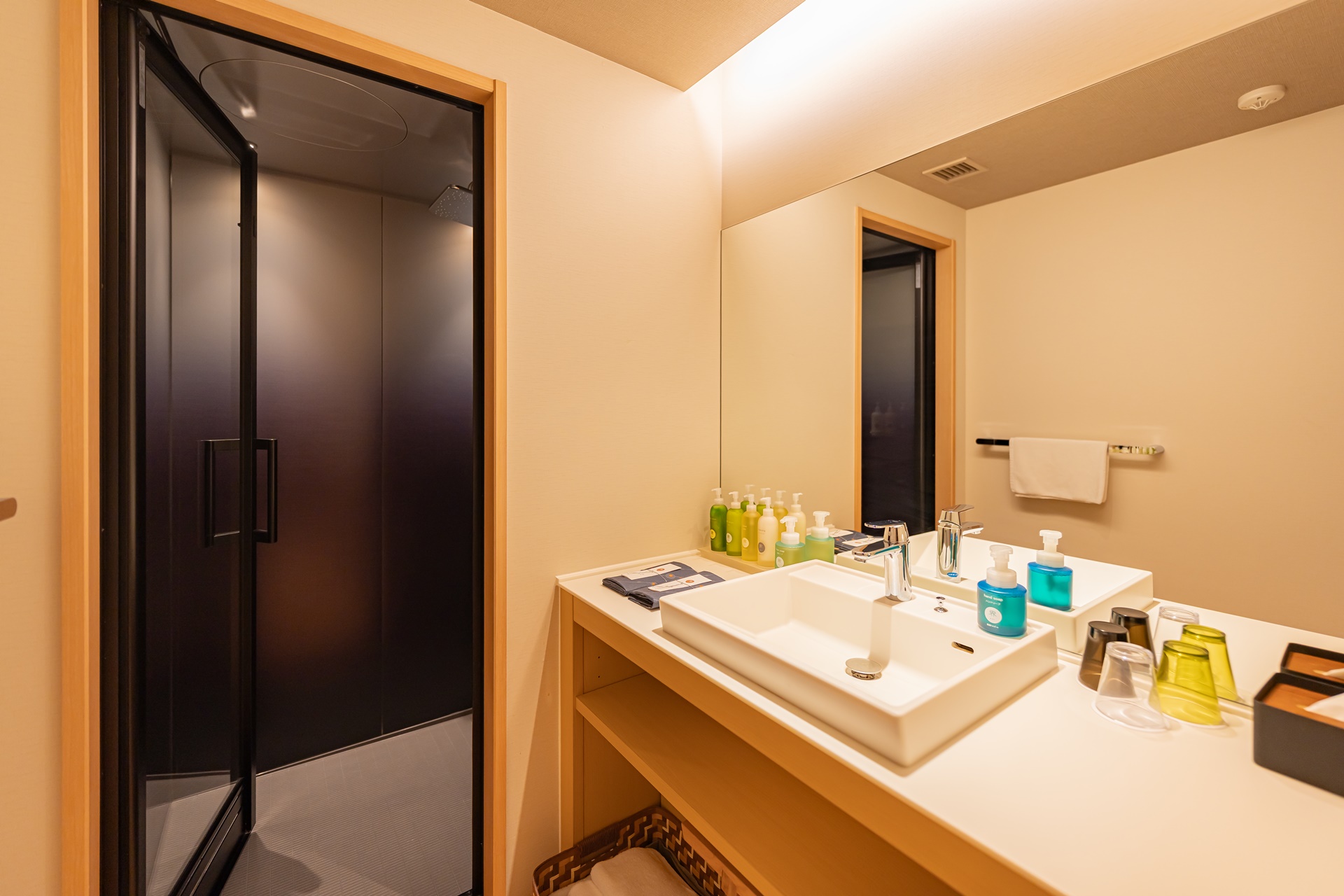 세면대, 샤워실과 호시노 리조트 카이 오리지널 브랜드인 어메니티들