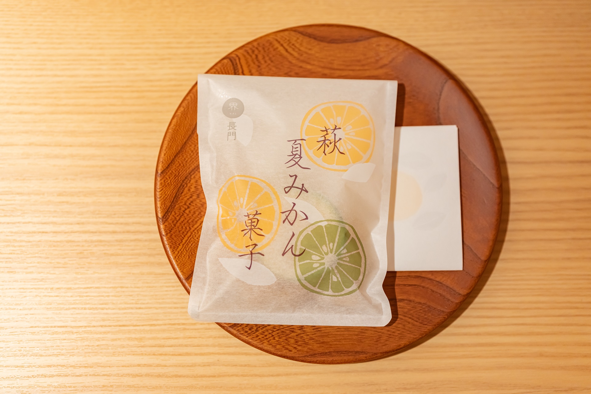 테이블 위의 웰컴 과자인 나가토 지역의 관광지 중 하나인 하기의 여름 밀감 말린 과자