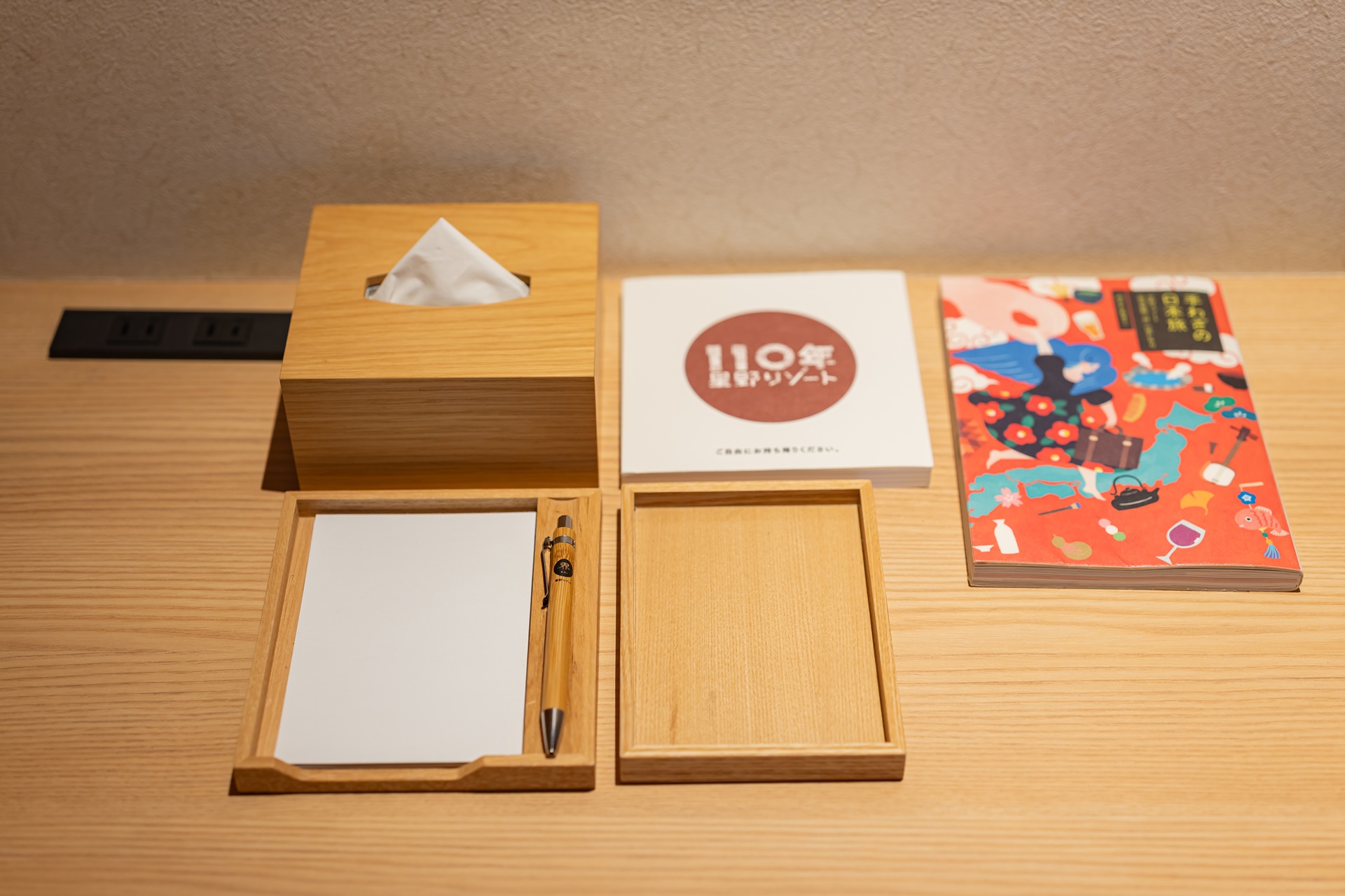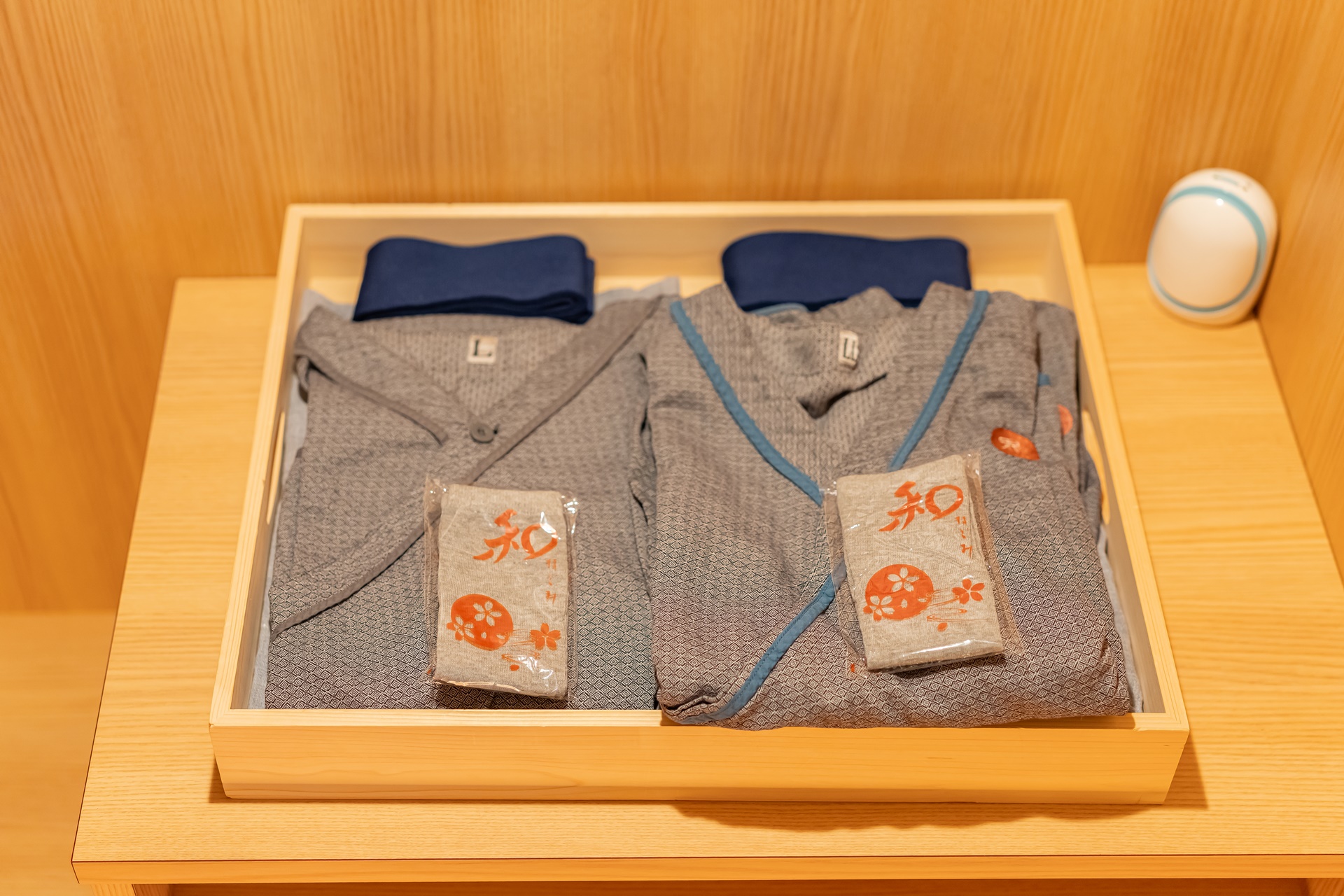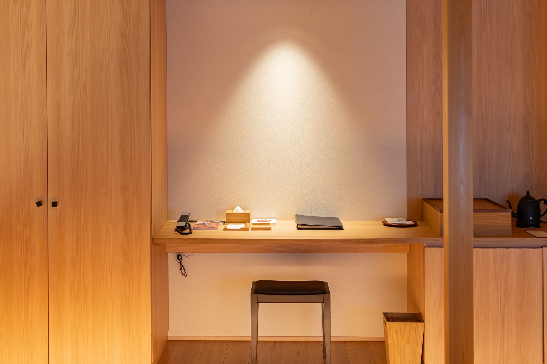 책상 위의 소품들과 옷장 안의 호시노 리조트 카이 나가토의 실내복