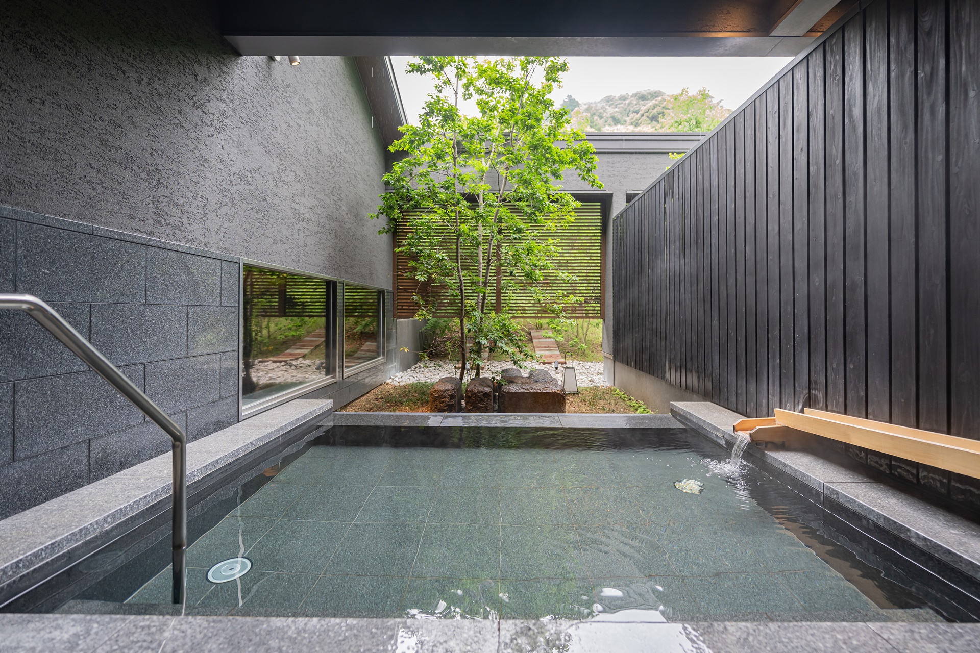 욕실으로 가는 길의 풍경과 온천을 즐기고 휴식을 취할 수 있는 공간