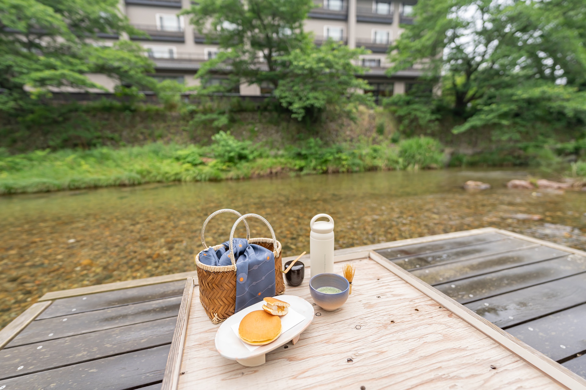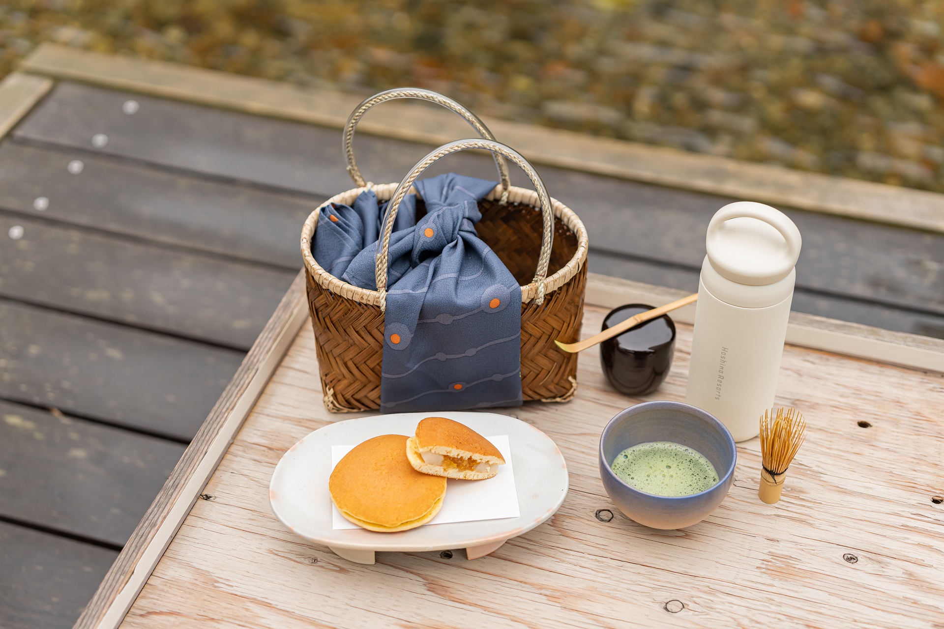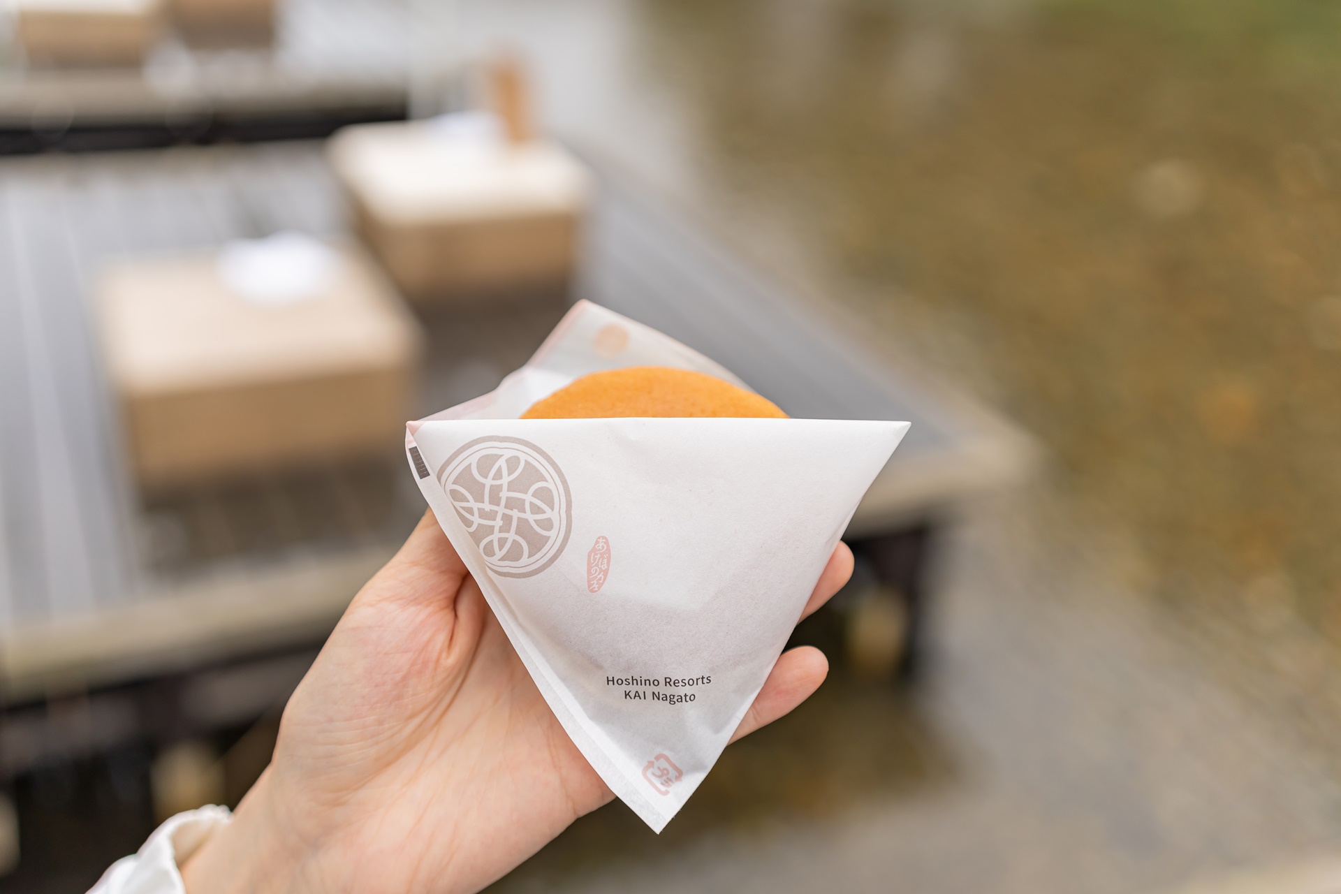 호시노 리조트 카이 나가토에는 강쪽 출구에 일본의 전통 간식은 도라야키와 음료를 판매하는 아케보노 카페가 있으며 이곳에서 도라야키와 음료를 즐길 수 있습니다. 말차 체험도 있으며 원하는 도자기(하기 야키) 잔을 골라 강가에서 마실 수 있습니다.