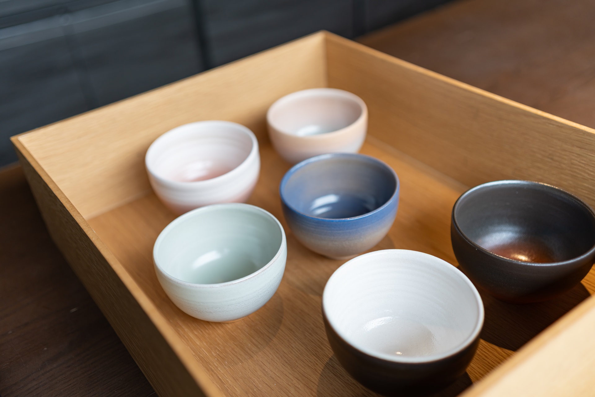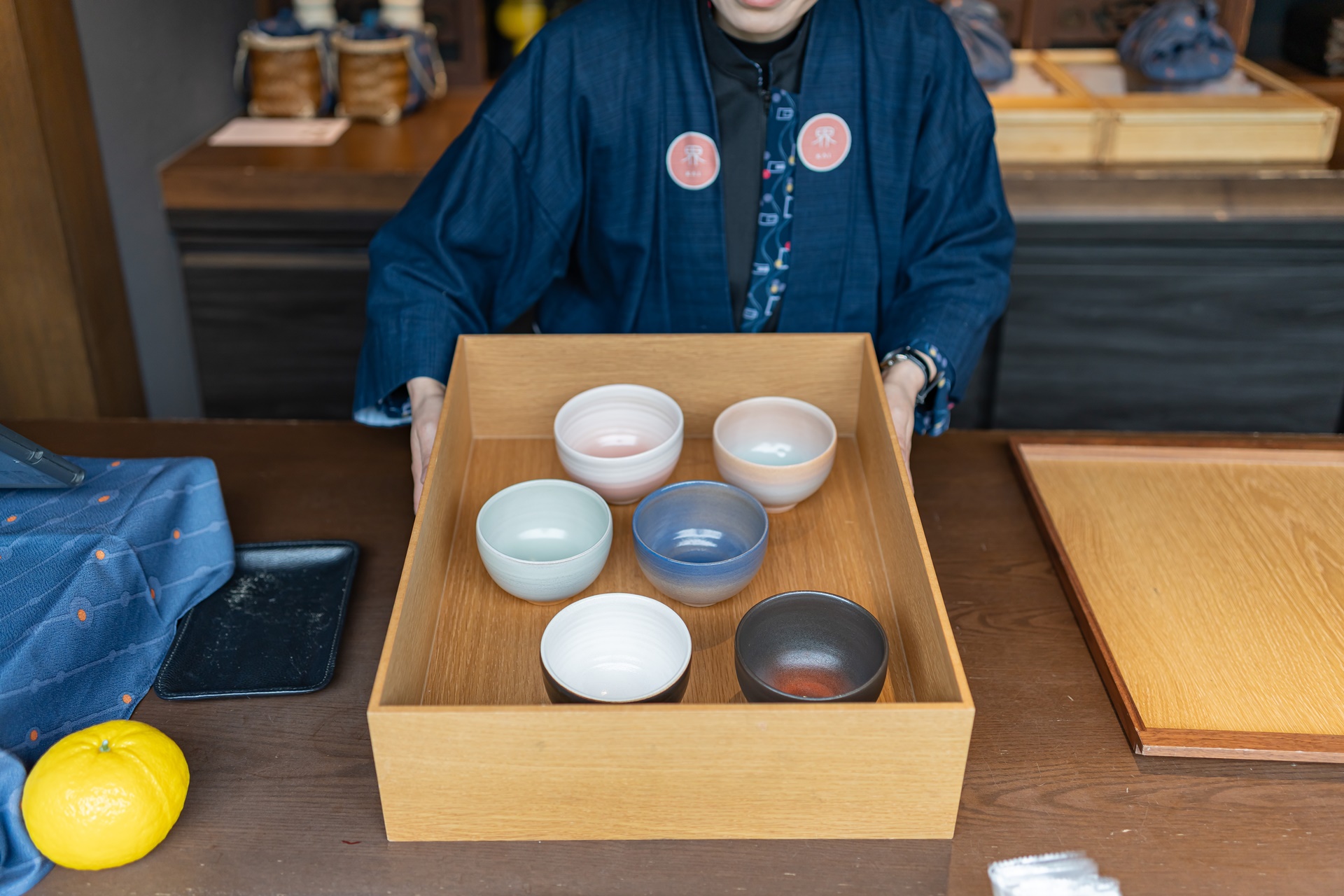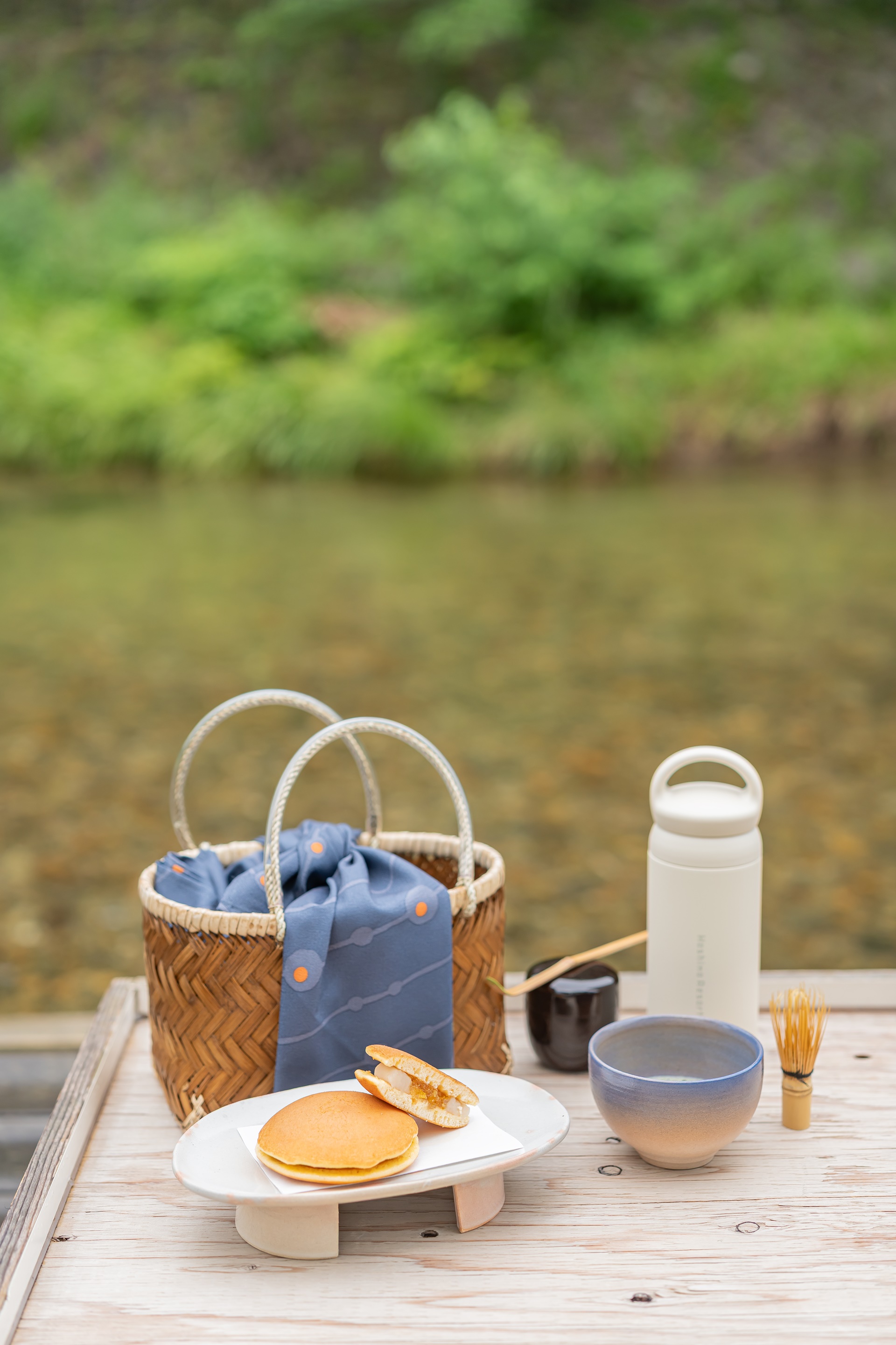 호시노 리조트 카이 나가토에는 강쪽 출구에 일본의 전통 간식은 도라야키와 음료를 판매하는 아케보노 카페가 있으며 이곳에서 도라야키와 음료를 즐길 수 있습니다. 말차 체험도 있으며 원하는 도자기(하기 야키) 잔을 골라 강가에서 마실 수 있습니다.