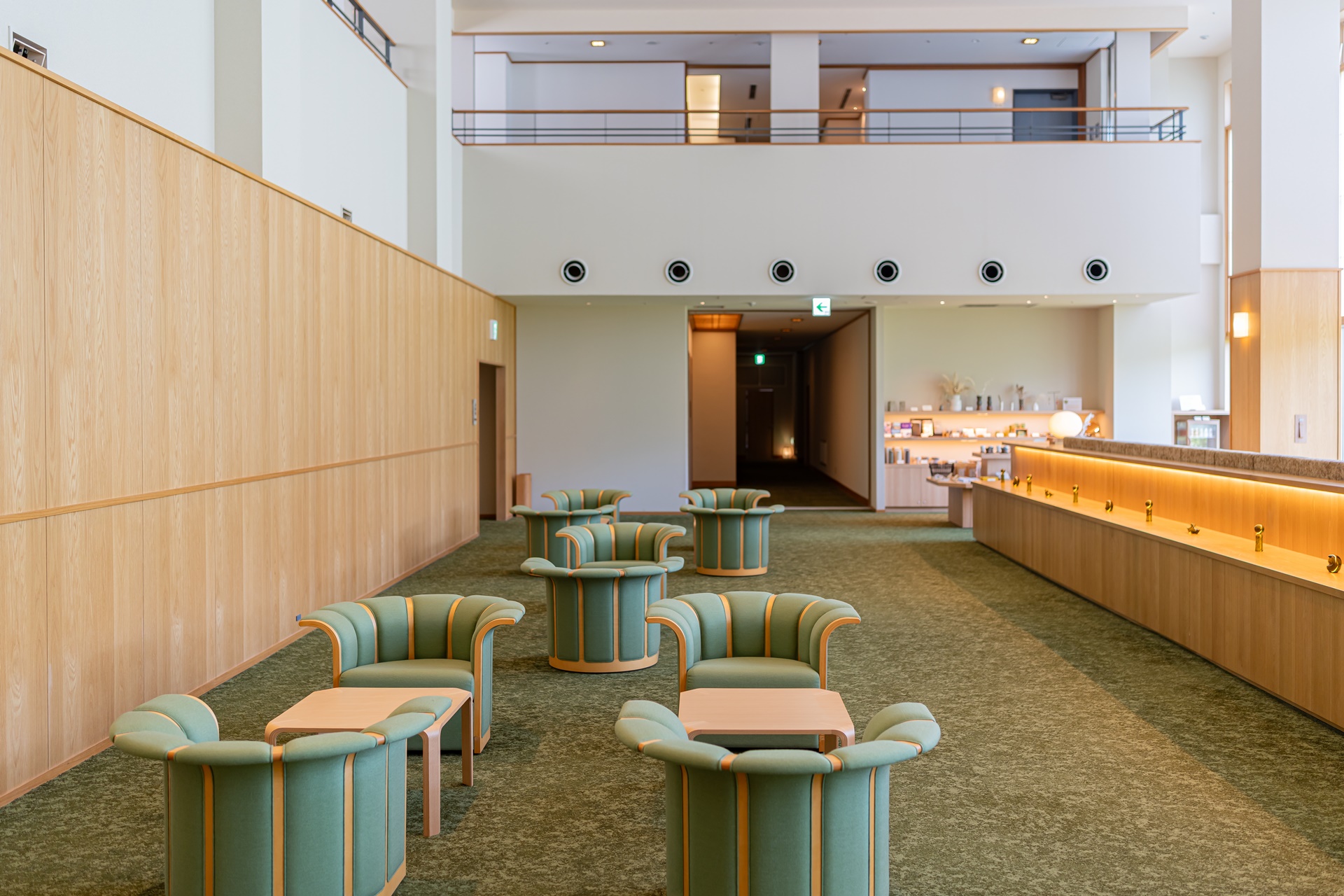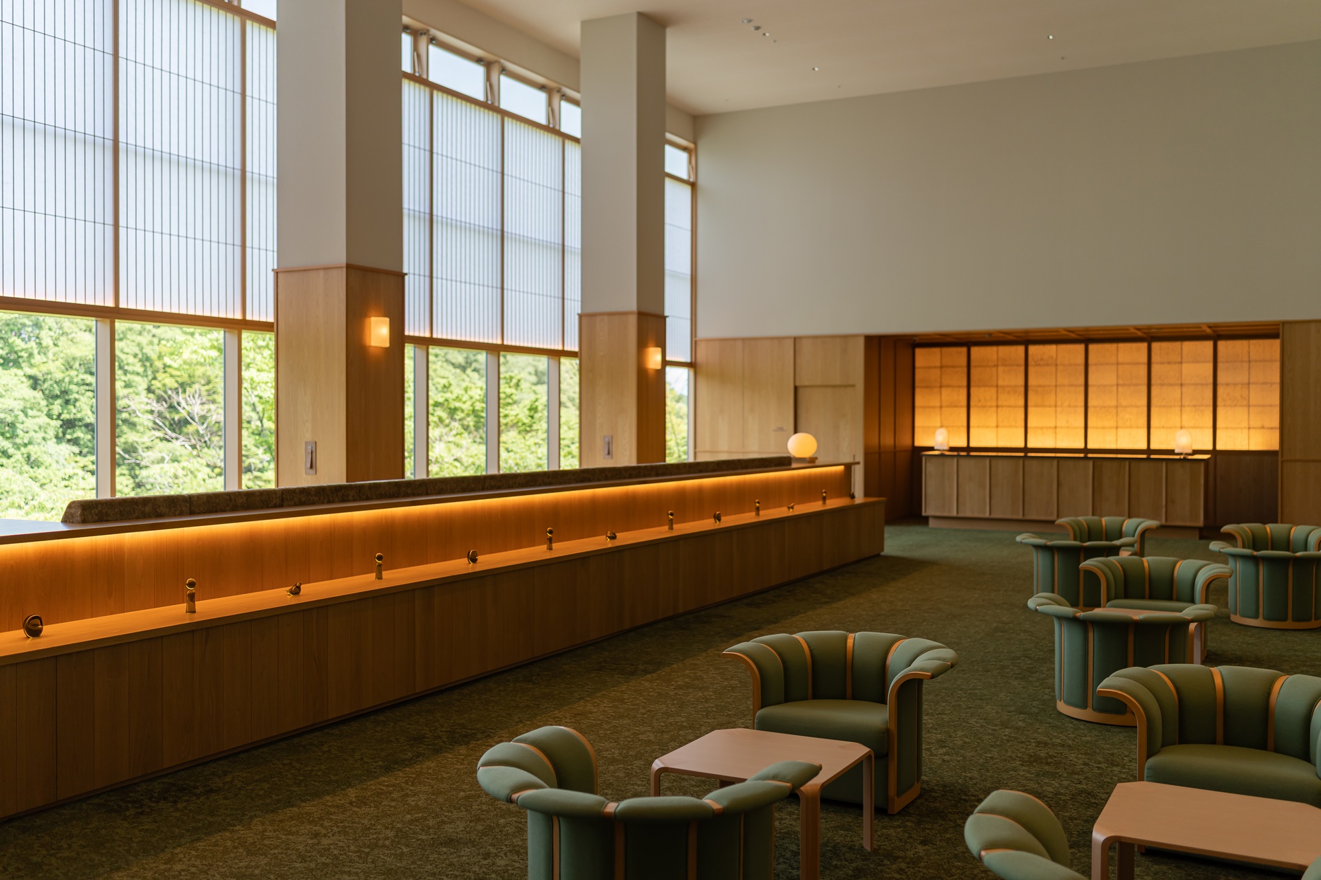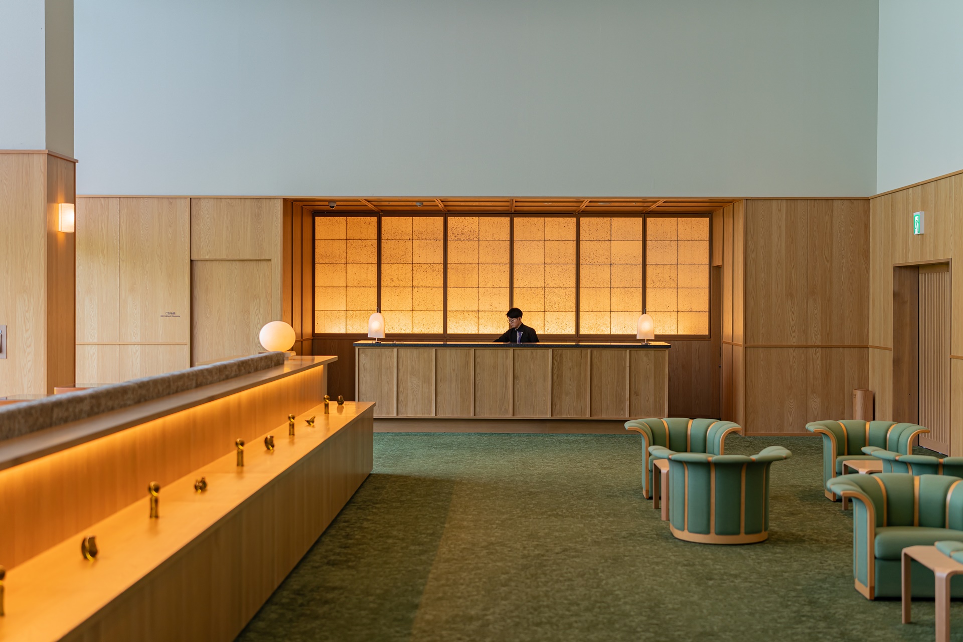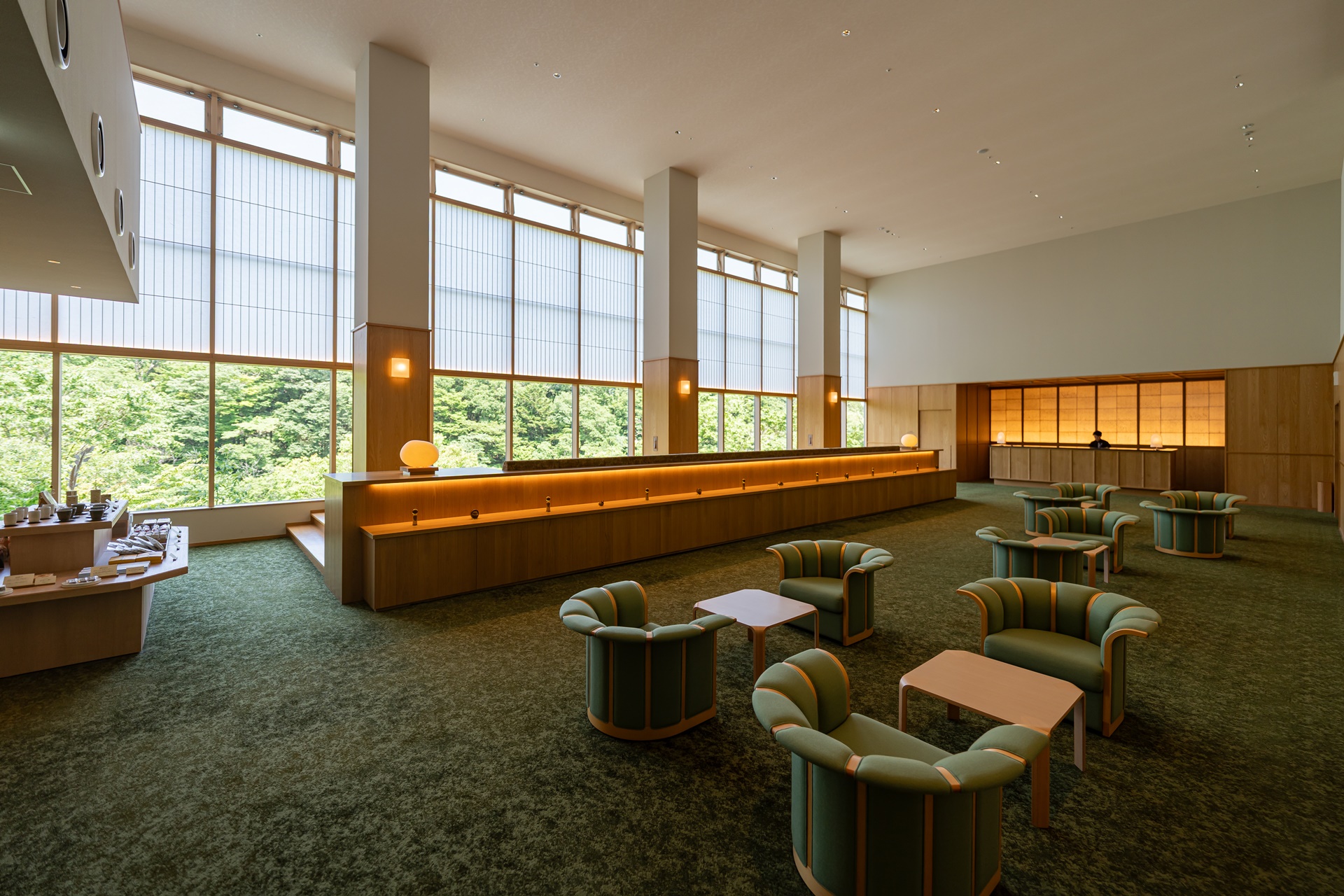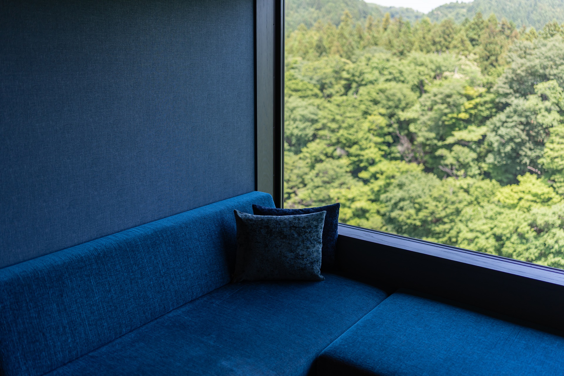 호시노 리조트 카이 아키우 로비에 들어서는 순간 눈에 들어오는 것은 깊은 청록빛과 짙은 파랑입니다. 이 색은 단순히 인테리어용 컬러가 아니라, 아키우 계곡의 물빛, 햇빛을 받은 물의 청록색, 그늘진 바위 근처의 짙은 파란색을 실내 공간으로 해석한 것입니다.