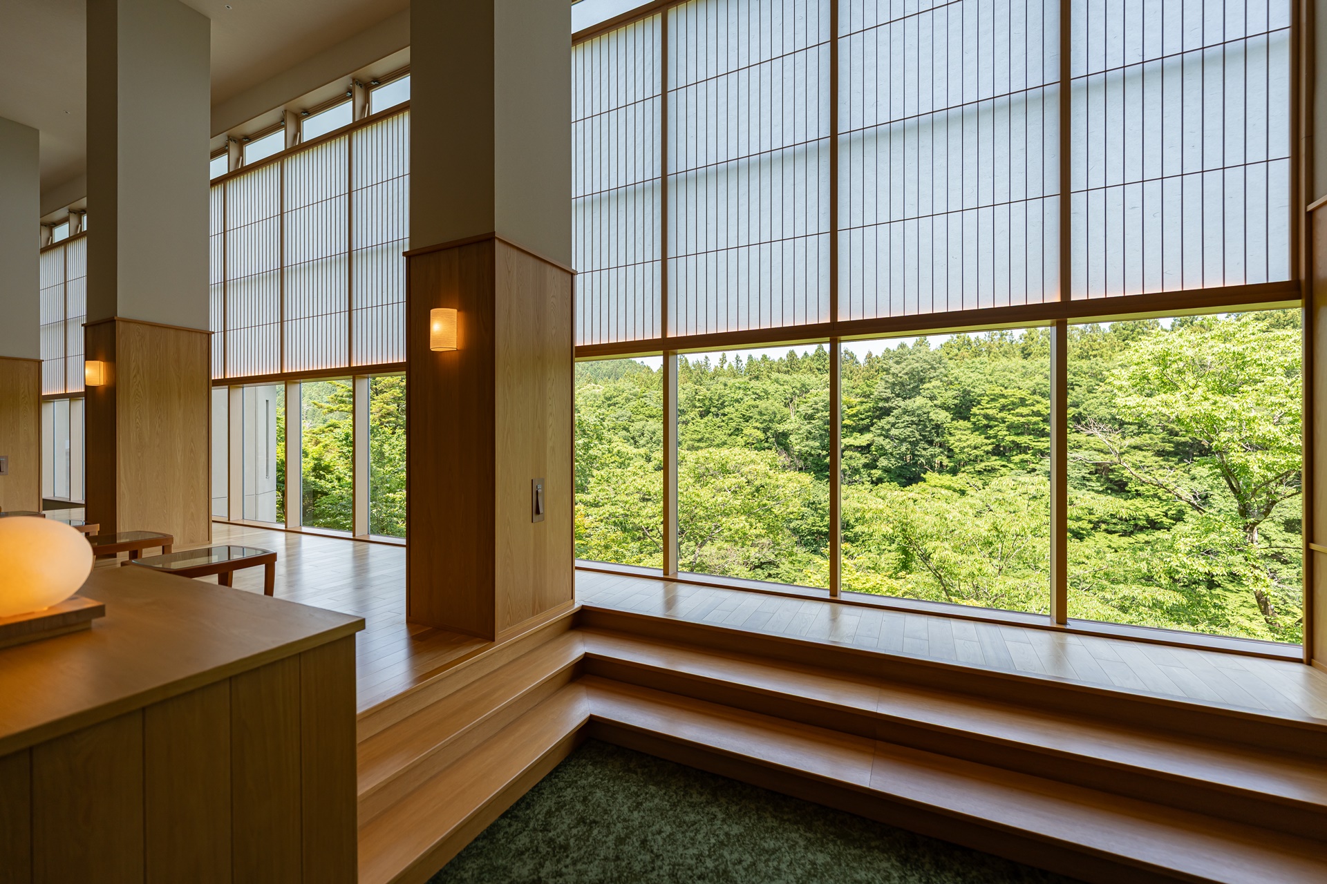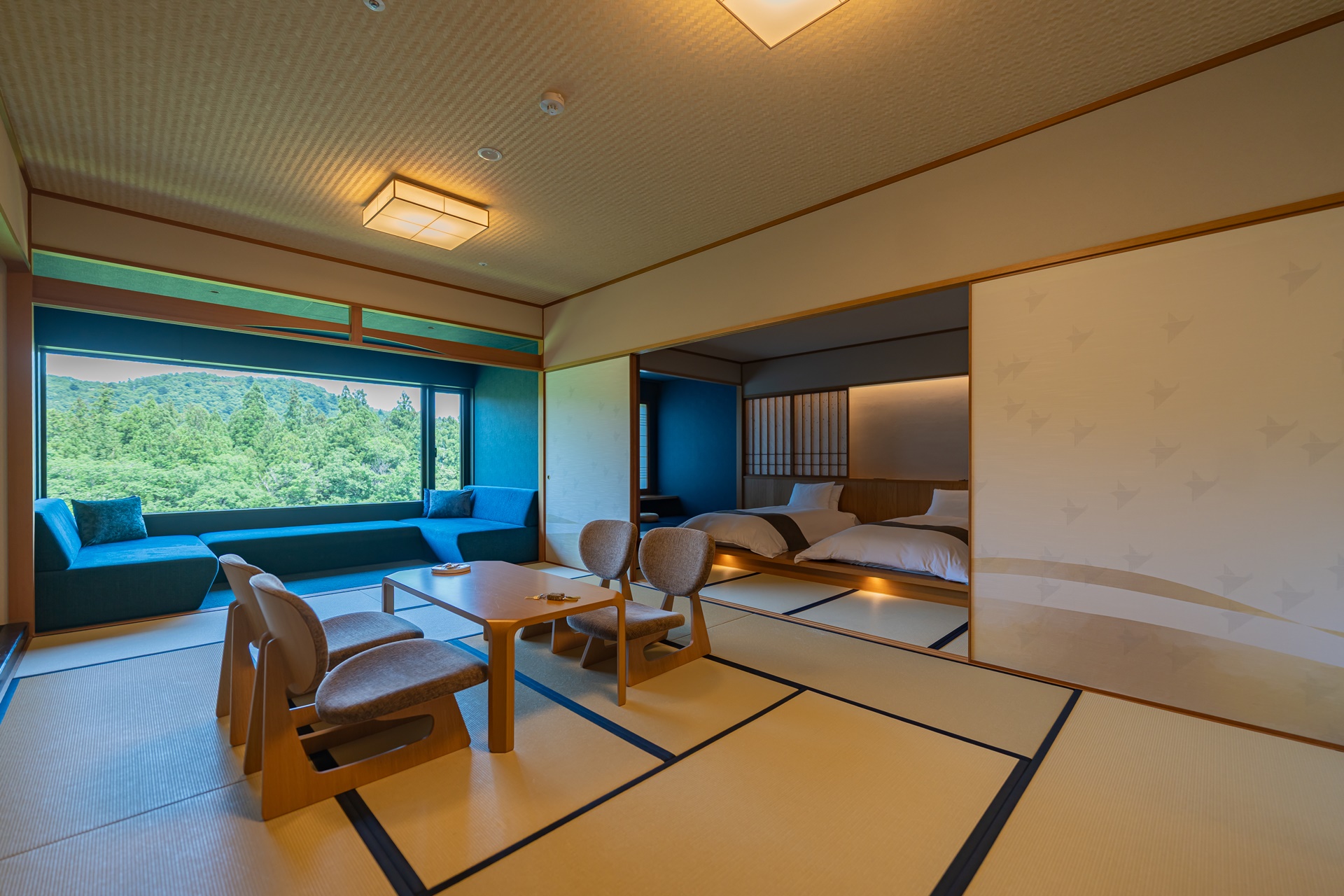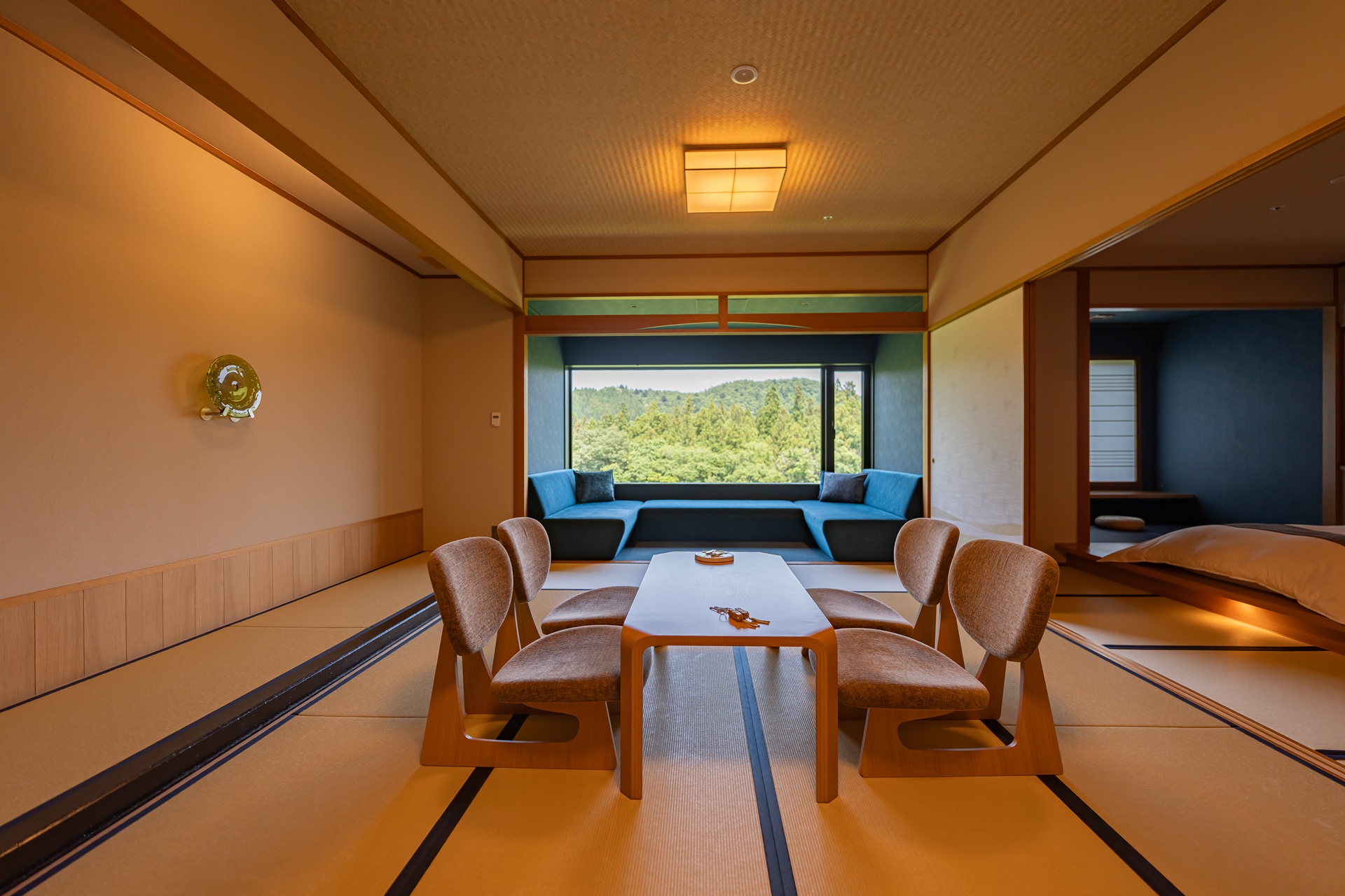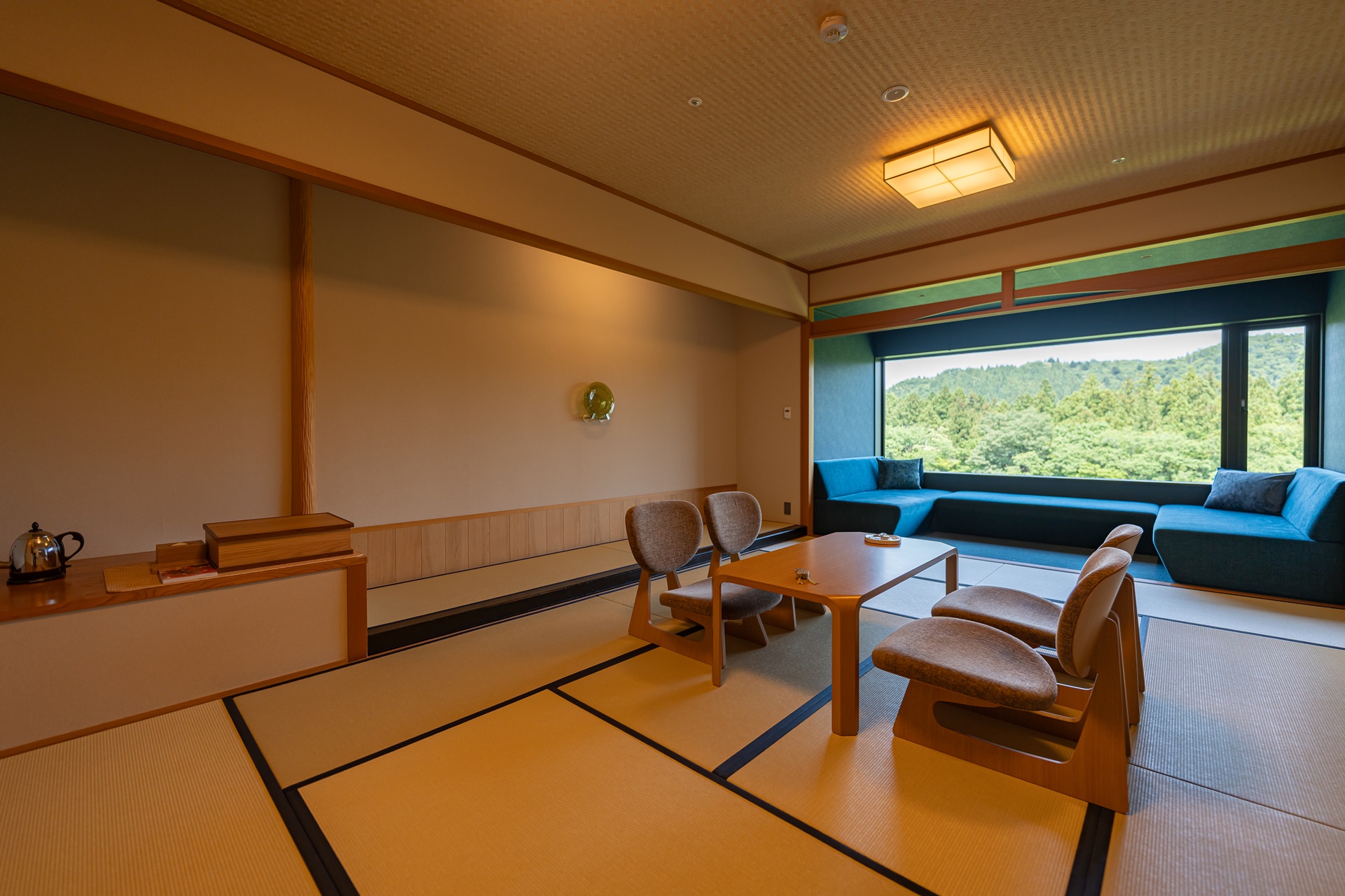 카이 아키우의 객실은 료칸 특유의 여백과 현대적 미니멀리즘을 결합한 구조입니다. 그 중에서도 이 객실을 특별하게 만드는 요소는 큰 창문으로 창문 너머에는 계곡, 숲, 강물,계 절이 바뀌는 풍경이 그대로 펼쳐집니다. 이 풍경은 단순한 객실 전망을 넘어 객실 구성의 중심 요소로 자리잡고 있습니다.