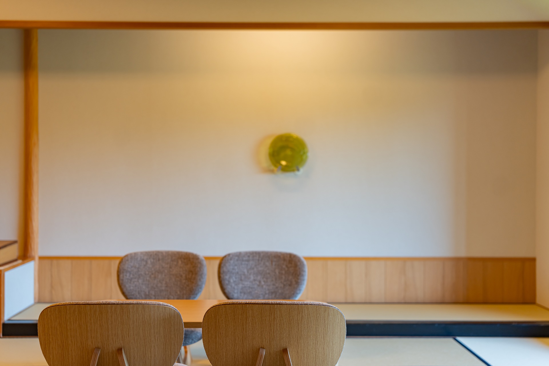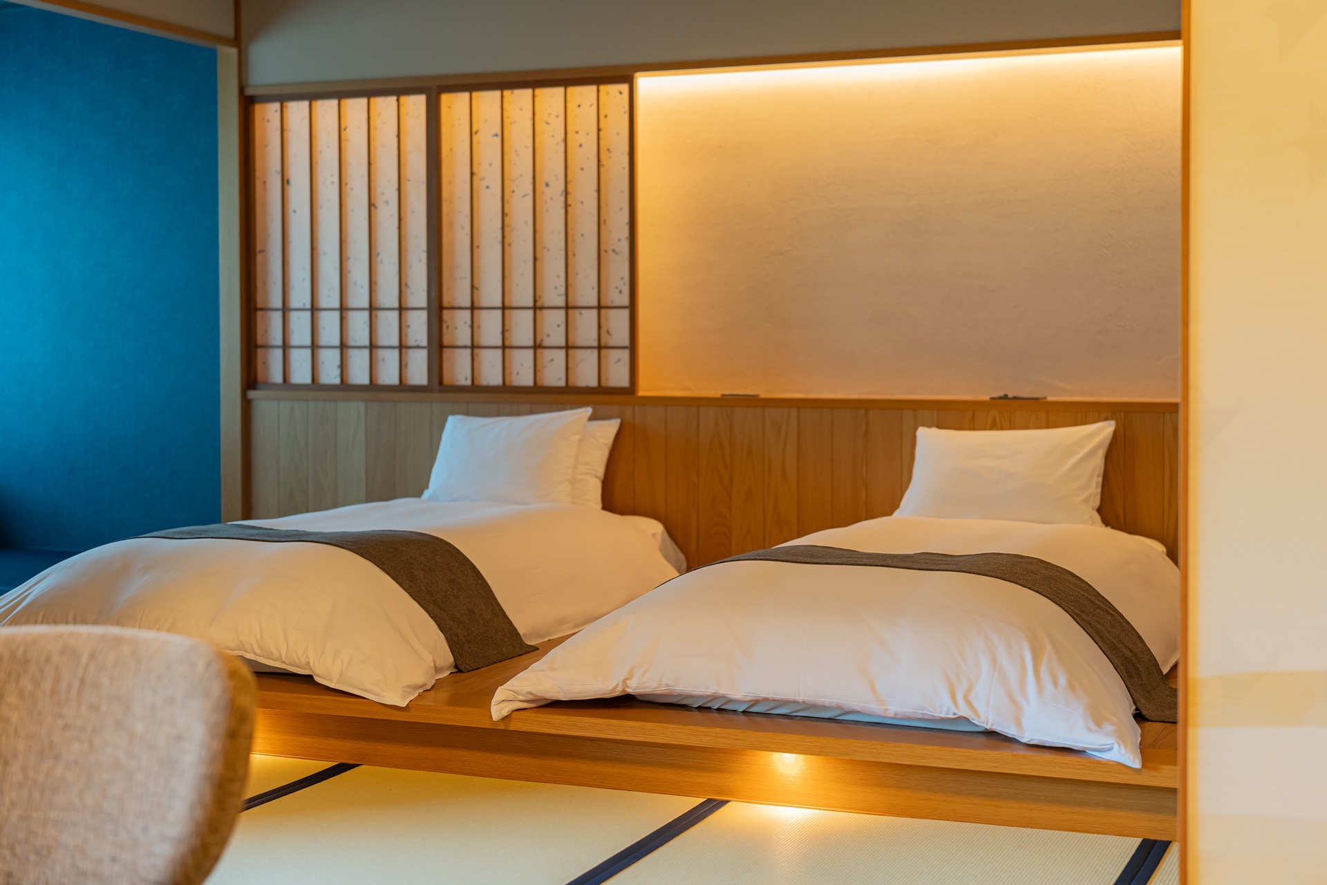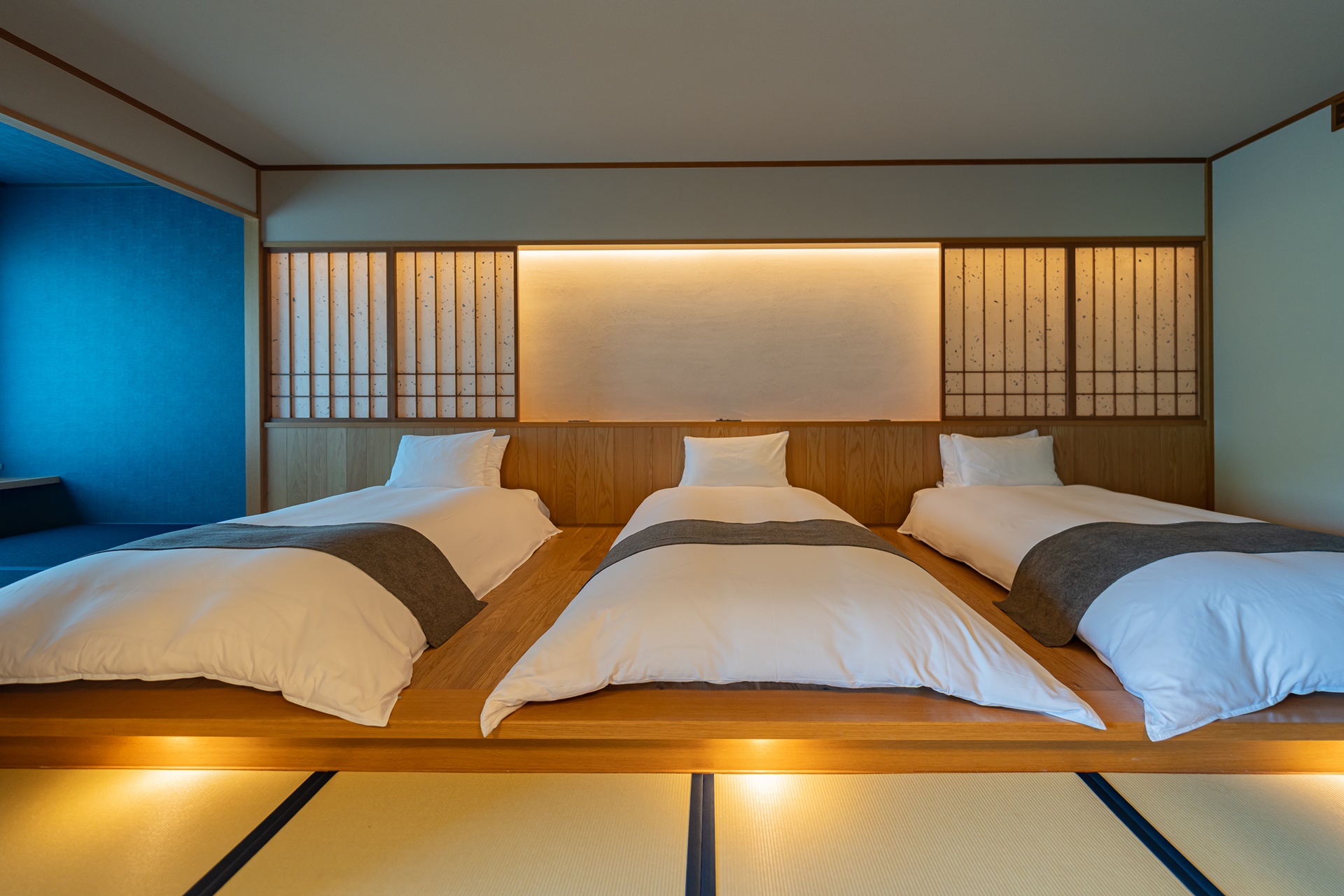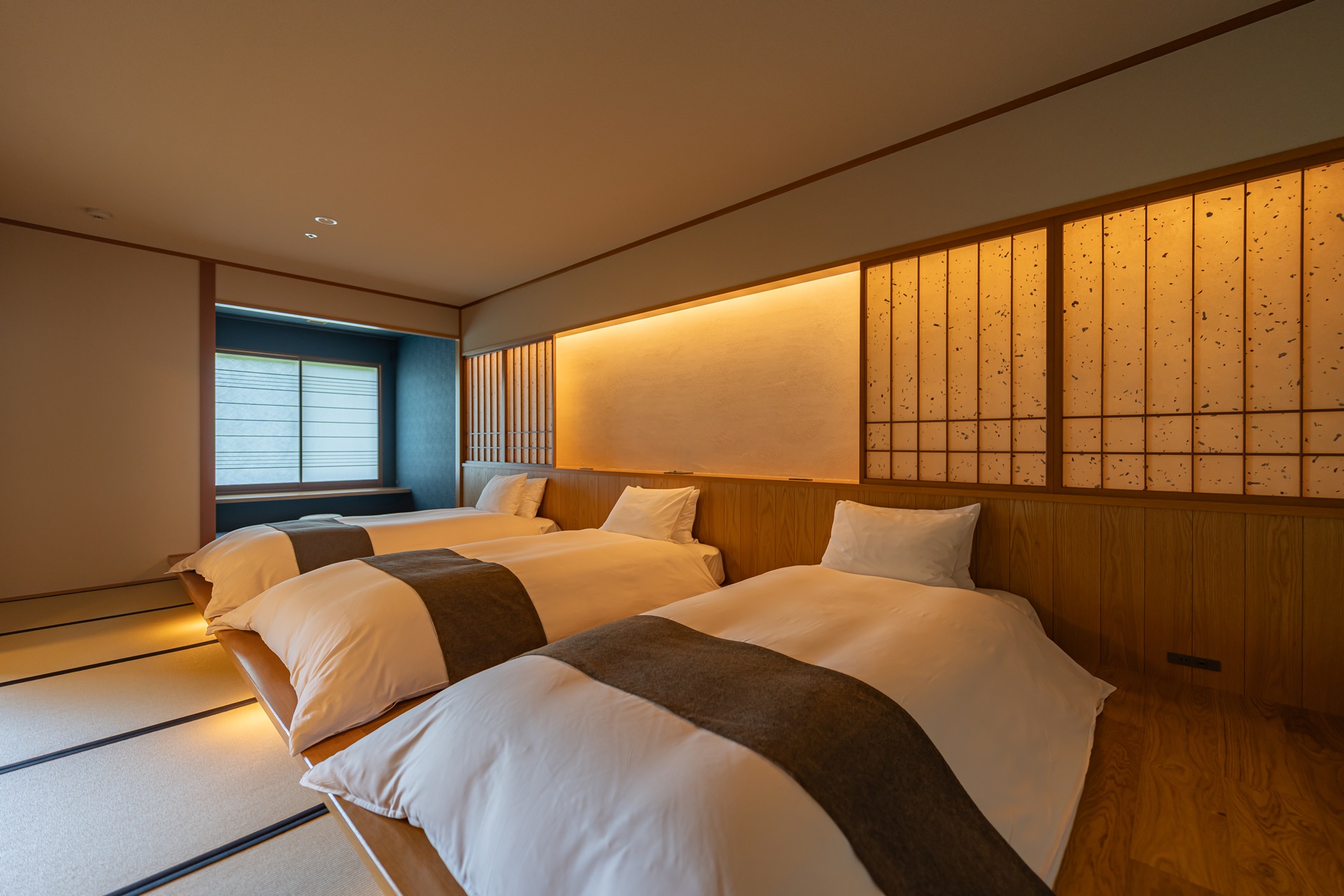 카이 아키우의 객실은 료칸 특유의 여백과 현대적 미니멀리즘을 결합한 구조입니다. 그 중에서도 이 객실을 특별하게 만드는 요소는 큰 창문으로 창문 너머에는 계곡, 숲, 강물,계 절이 바뀌는 풍경이 그대로 펼쳐집니다. 이 풍경은 단순한 객실 전망을 넘어 객실 구성의 중심 요소로 자리잡고 있습니다.