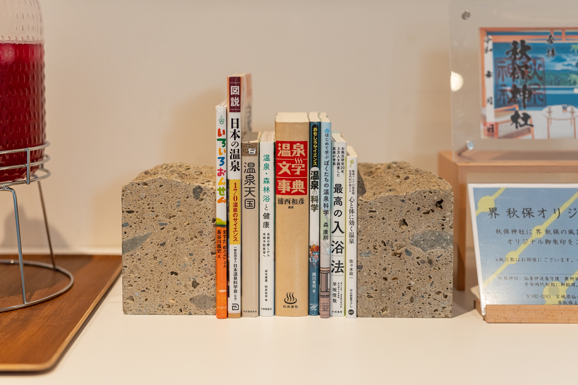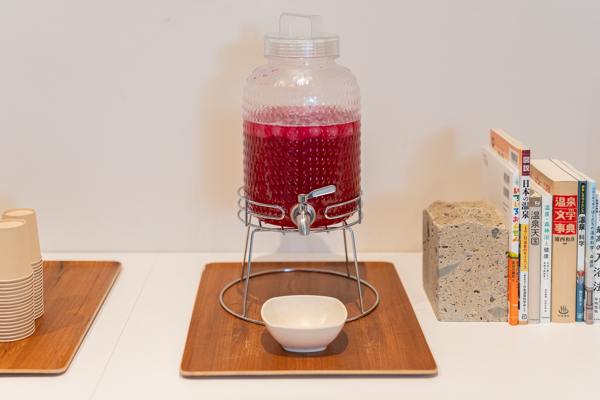 수분 보충을 위한 음료들이 준비되어 있고 온천에 대한 정보를 얻을 수 있는 서적도 잘 정리되어 있었습니다.