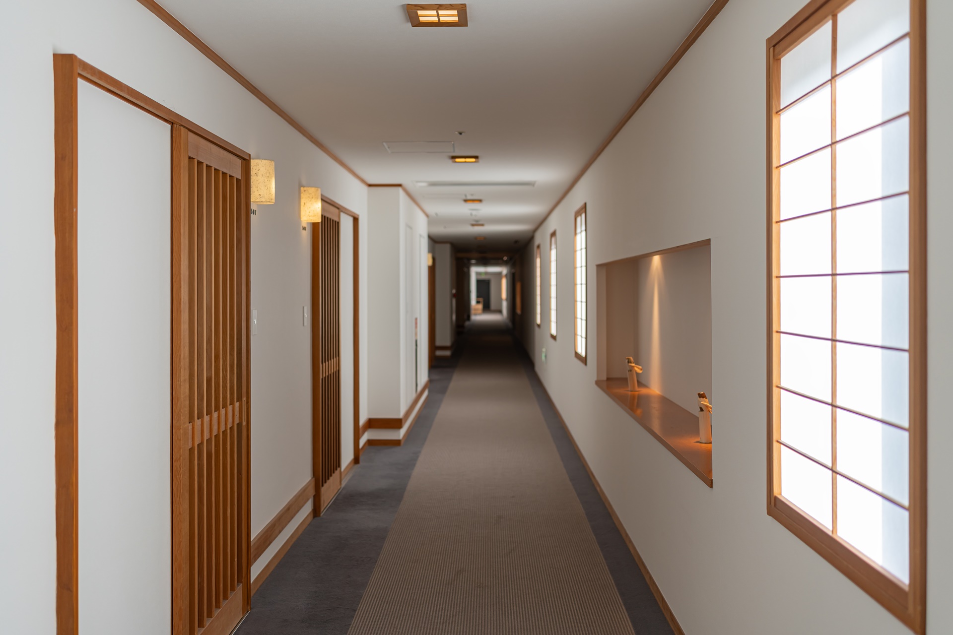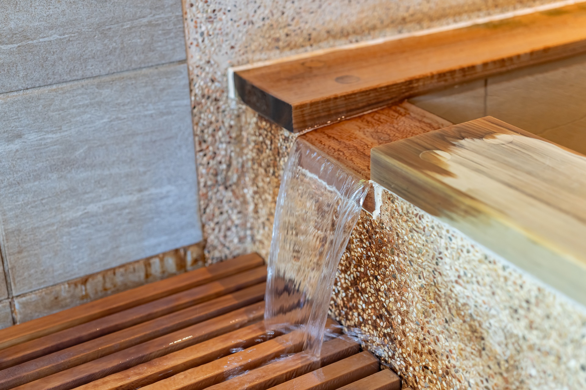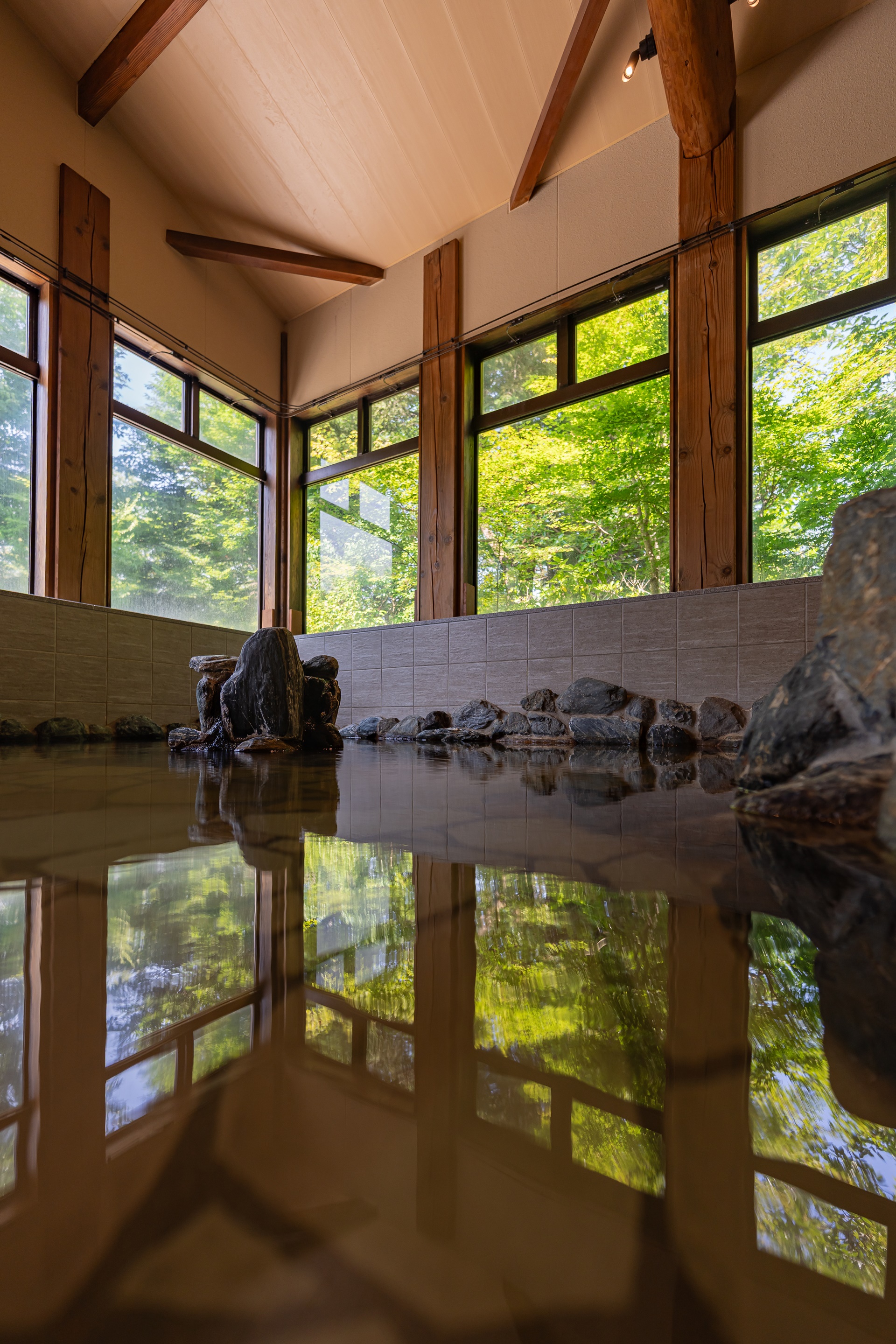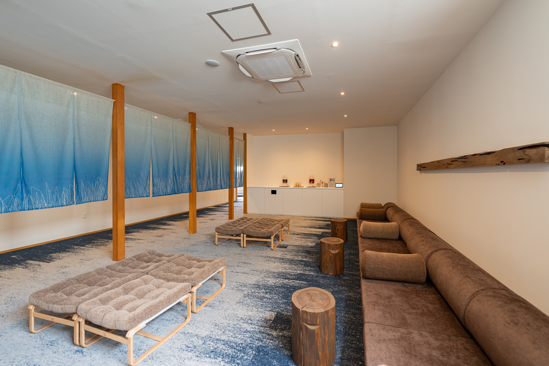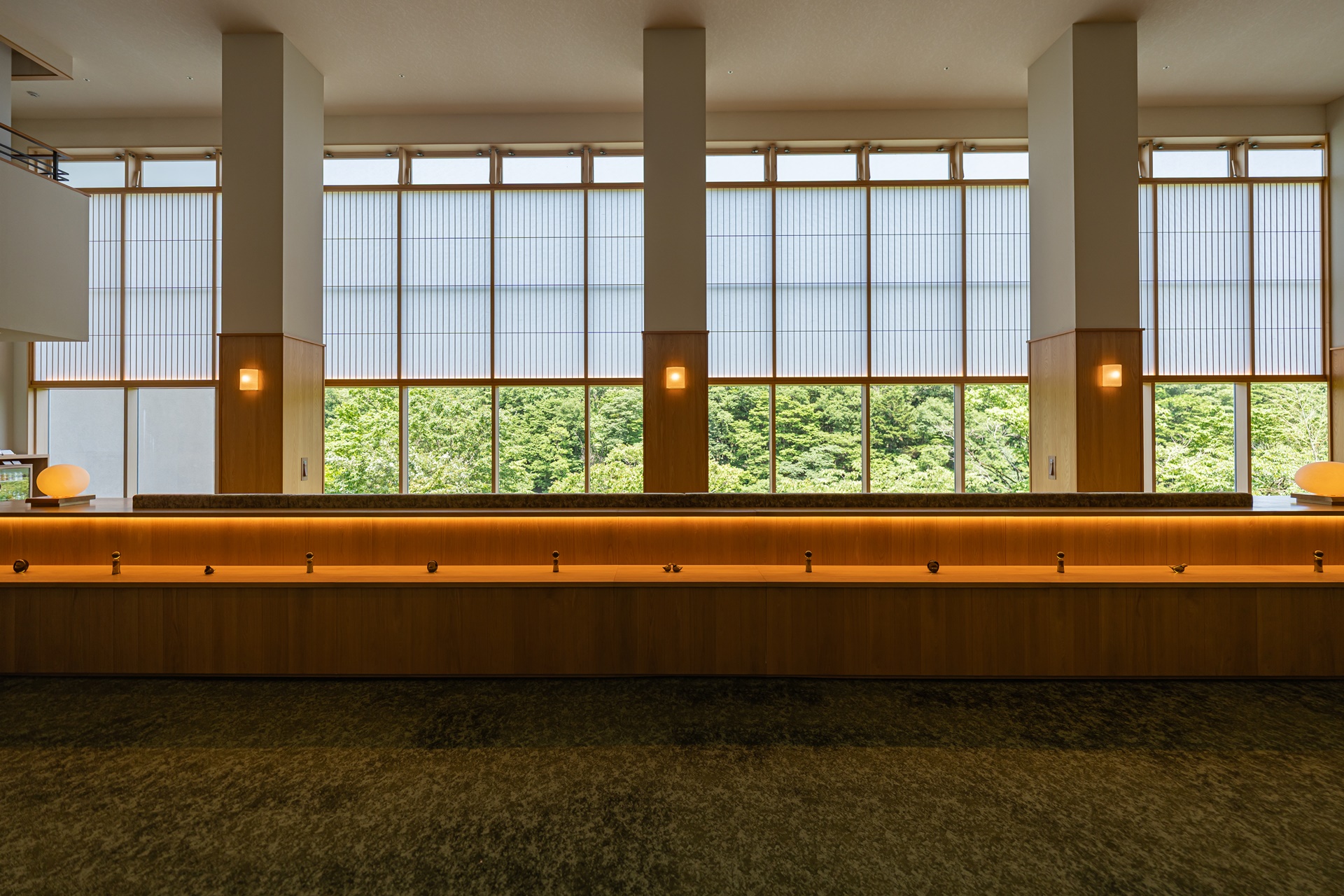 조명은 과하게 밝지 않고, 은은하게 실내를 감싸는 형태로 배치되어 있고, 이는 시각적 자극을 최소화하여 여행자가 자연스럽게 속도를 낮추도록 유도합니다. 로비 곳곳에는 물 흐르는 소리, 목재의 질감, 자연에서 가져온 재질감이 스며 있어 공간 자체가 계곡의 분위기를 실내에서 그대로 느끼게 해 줍니다.