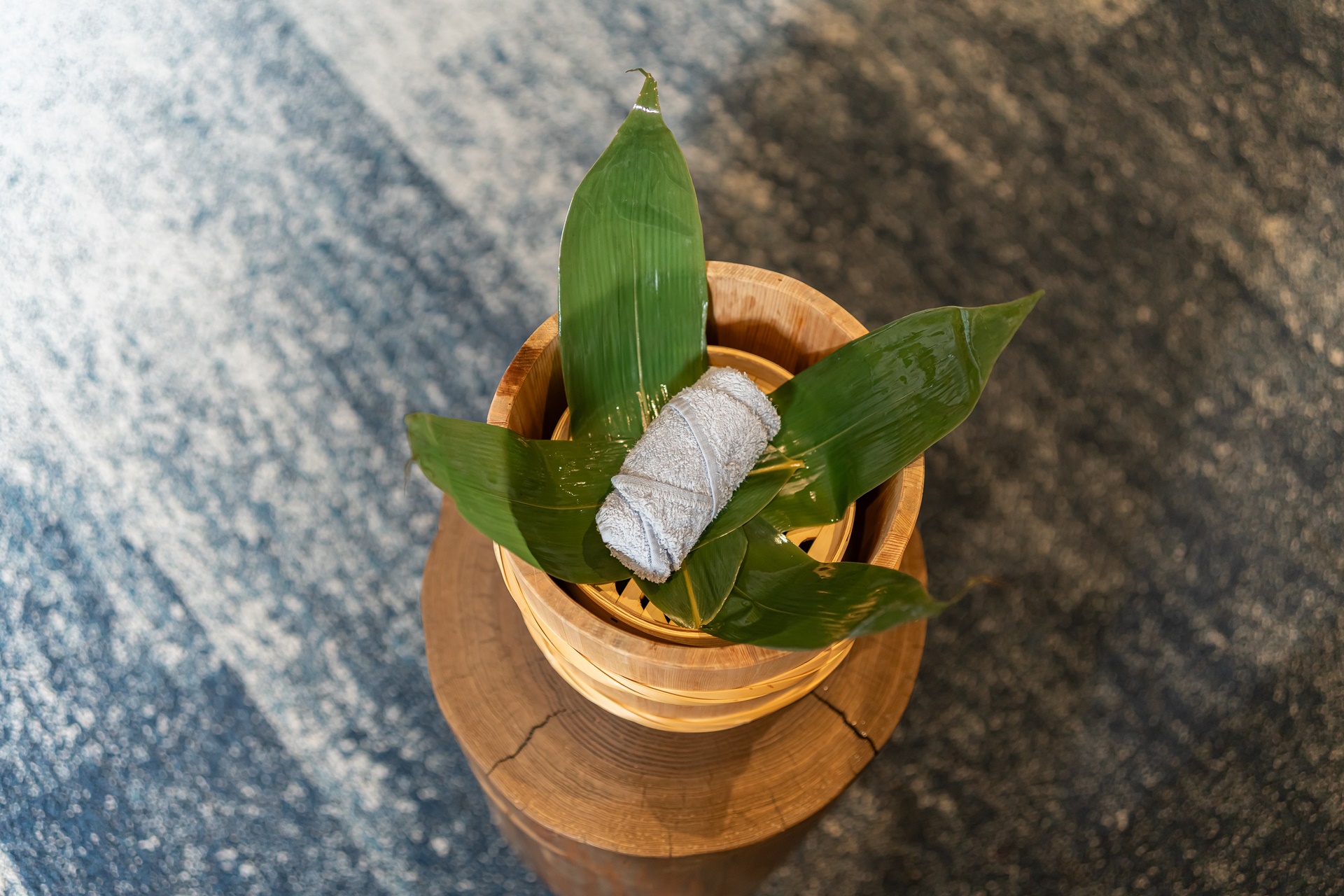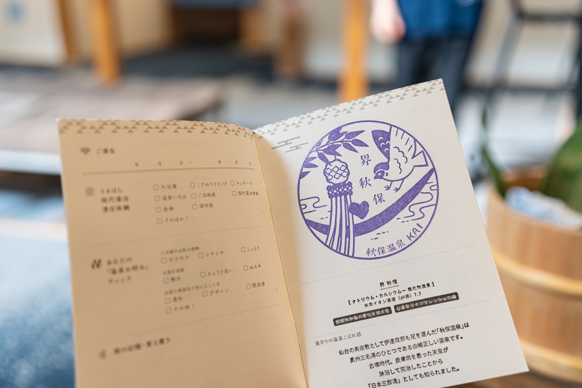 풀잎향이 강한 따뜻한 타올로 손을 닦고 온천에 대한 설명을 듣습니다. 이 엑티비티를 하고 나면 스템프가 찍힌 카이의 온천 수첩을 받을 수 있고 다른 호시노 리조트의 카이 시설에서도 스템프를 받을 수 있습니다.