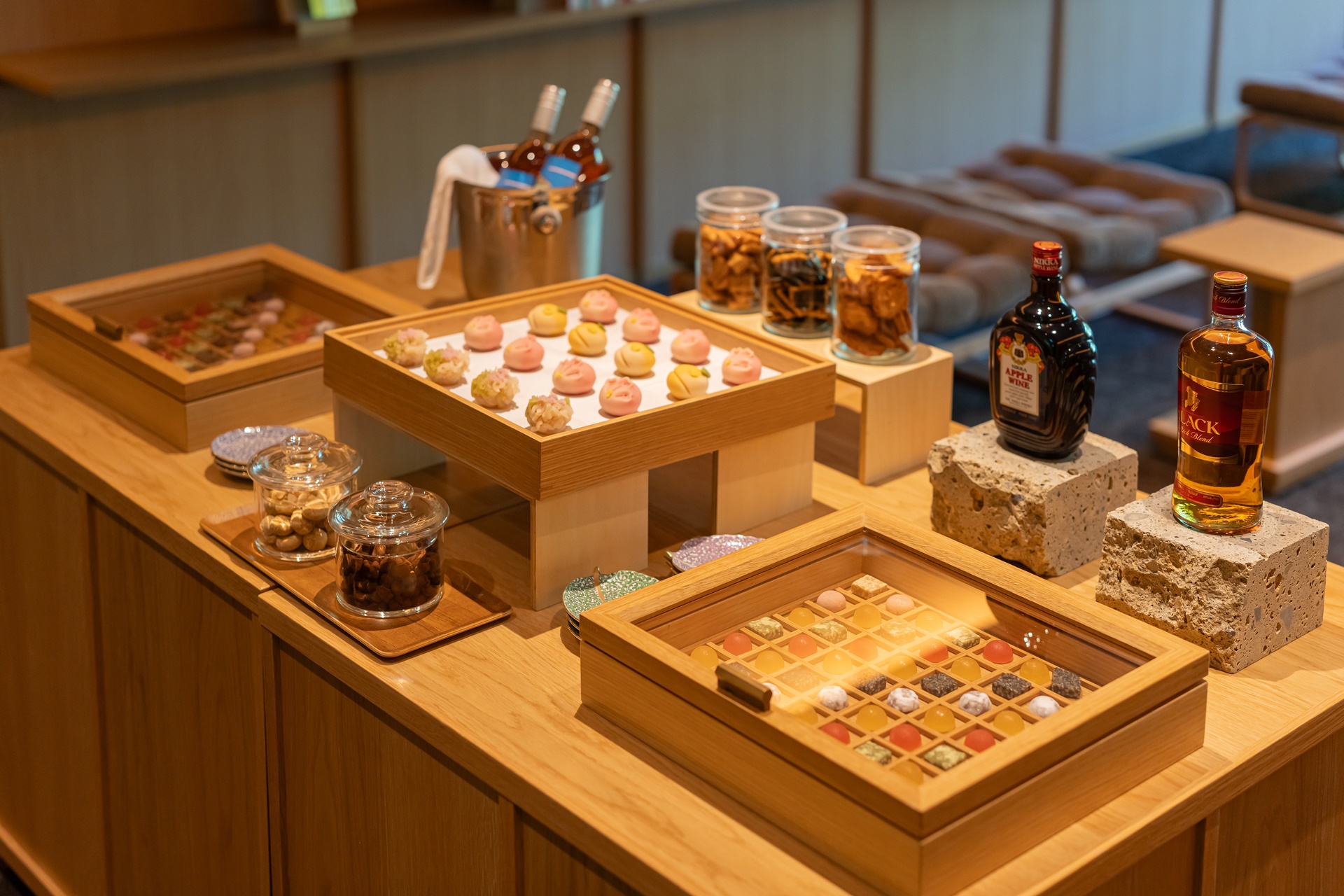 라운지에는 다양한 음료와 과자가 준비되어 있습니다.