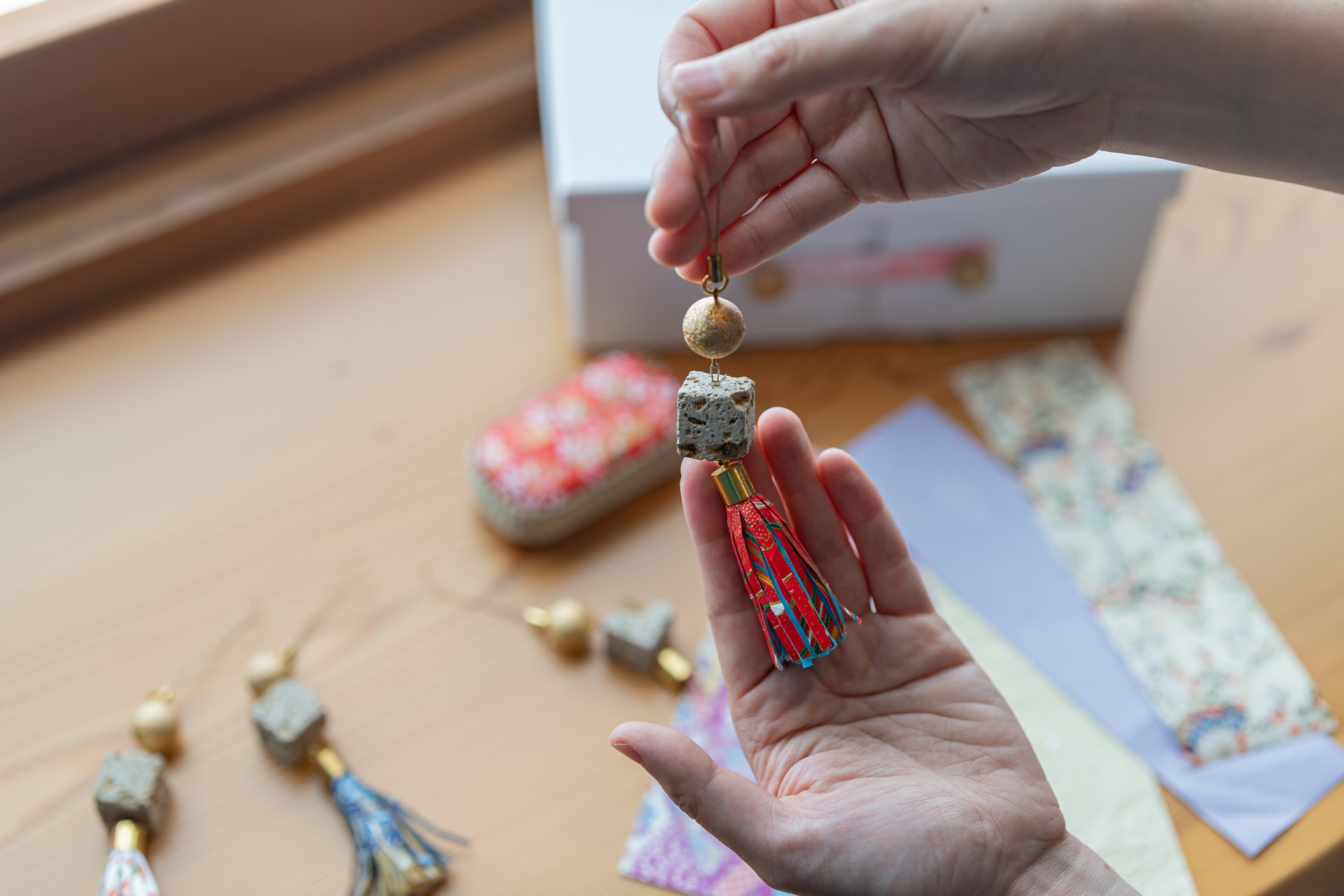 방안에서 즐기는 엑티비티로 아키우 돌을 이용하여 열쇠고리를 만들 수 있습니다.