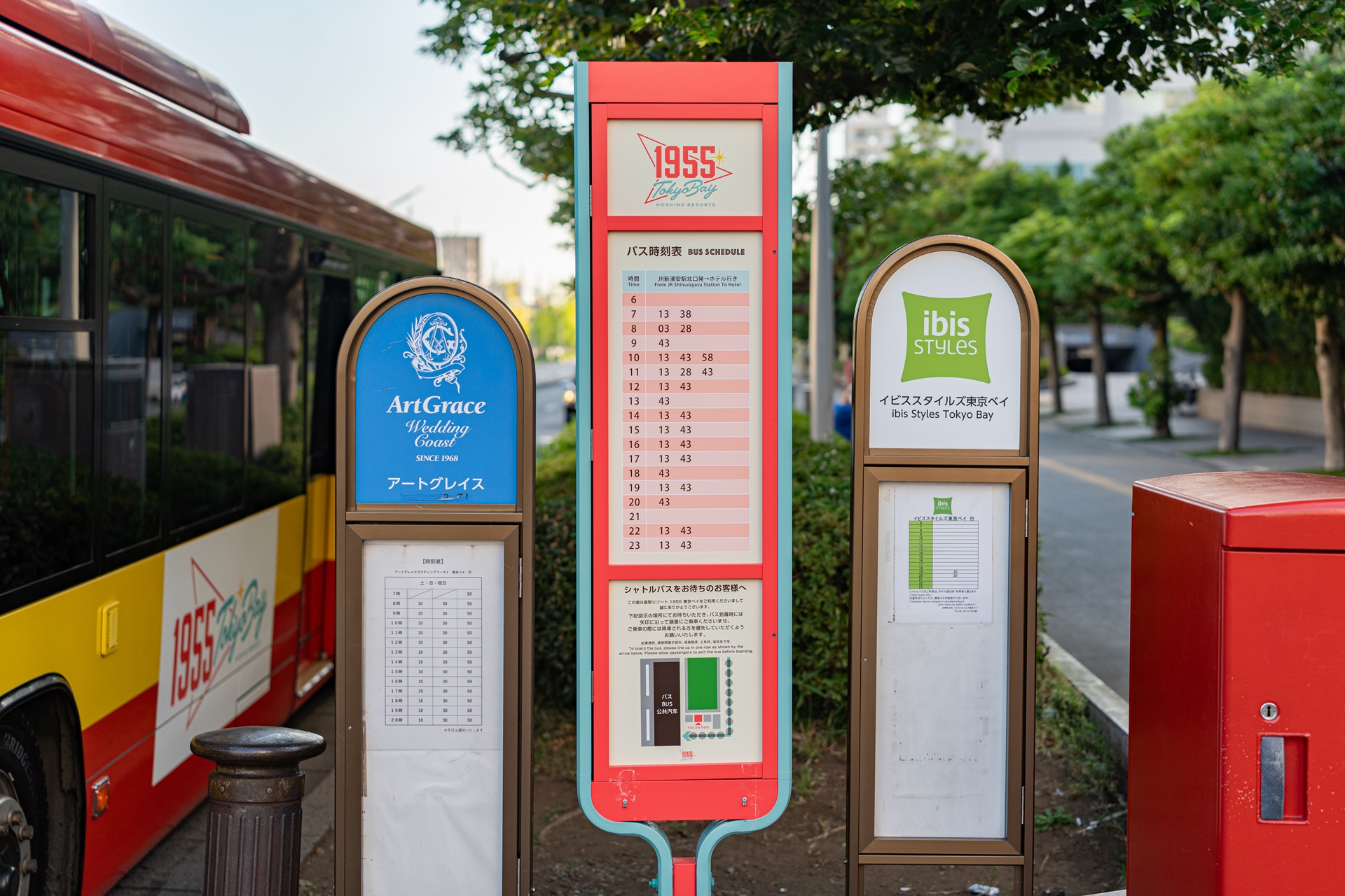 도쿄 디즈니 리조트(약 30분 소요)와 신우라야스역(약 10분 소요)을 오가는 무료 셔틀버스를 운행합니다. 예약은 불필요 하며 호텔에 붙어져 있는 시간표를 보고 이용하면 됩니다.