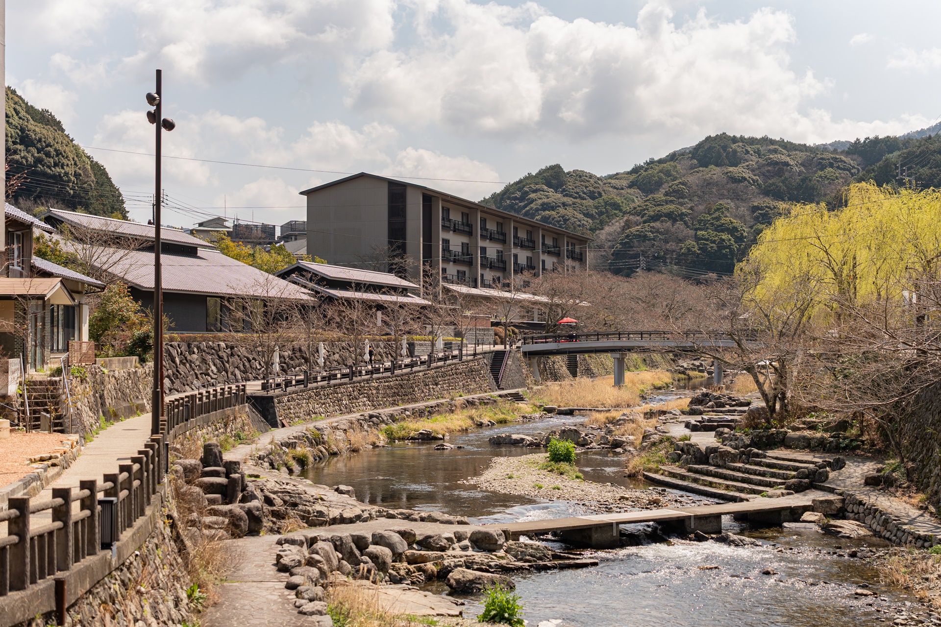 당시 호시노 대표는 단순히 자신의 리조트 하나를 잘 짓는 것에 그치지 않고, "마을 전체의 매력을 높여 전국 온천 랭킹 10위권에 진입하겠다"는 원대한 목표와 함께 '오소토 천국(마을 밖이 천국)'이라는 컨셉을 역제안했습니다. 숙소 안에서만 모든 것을 해결하던 기존의 방식에서 벗어나, 관광객이 유카타를 입고 마을 골목과 강변을 거닐며 즐거운 시간을 보낼 수 있는 구조를 만들자는 것이었죠. 이에 오니시 쿠라오 당시 시장이 행정적 전폭 지원을 약속하며 민관 협력의 강력한 톱니바퀴가 돌아가기 시작했습니다.