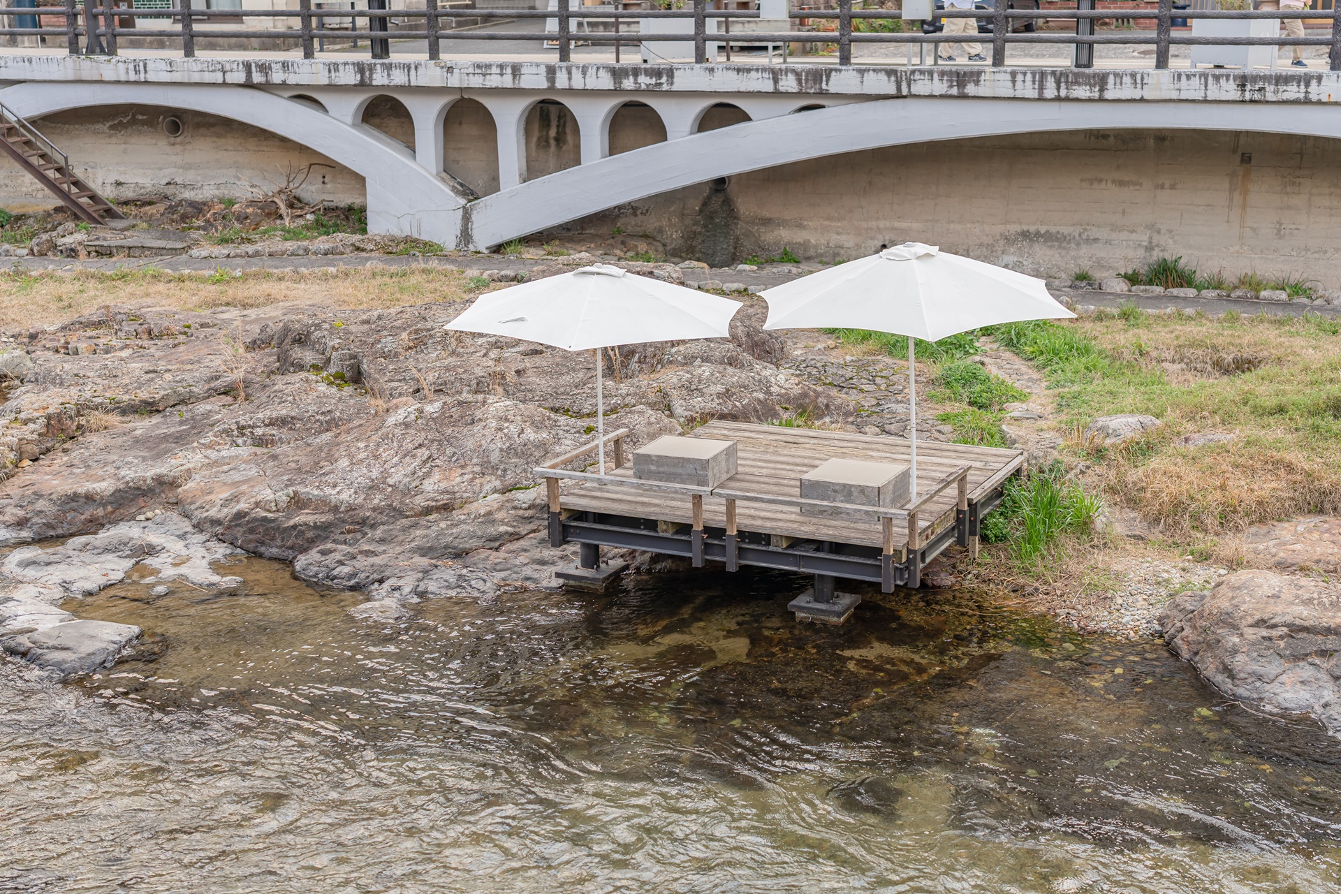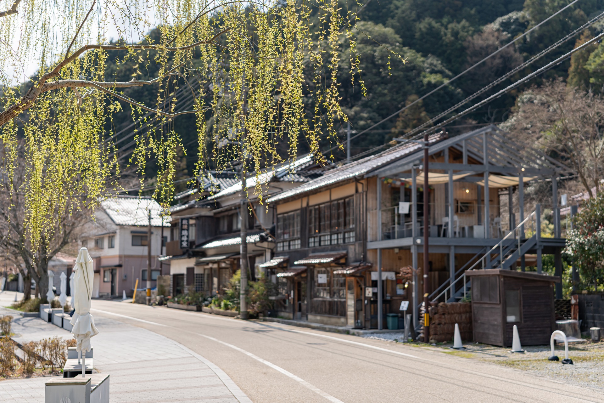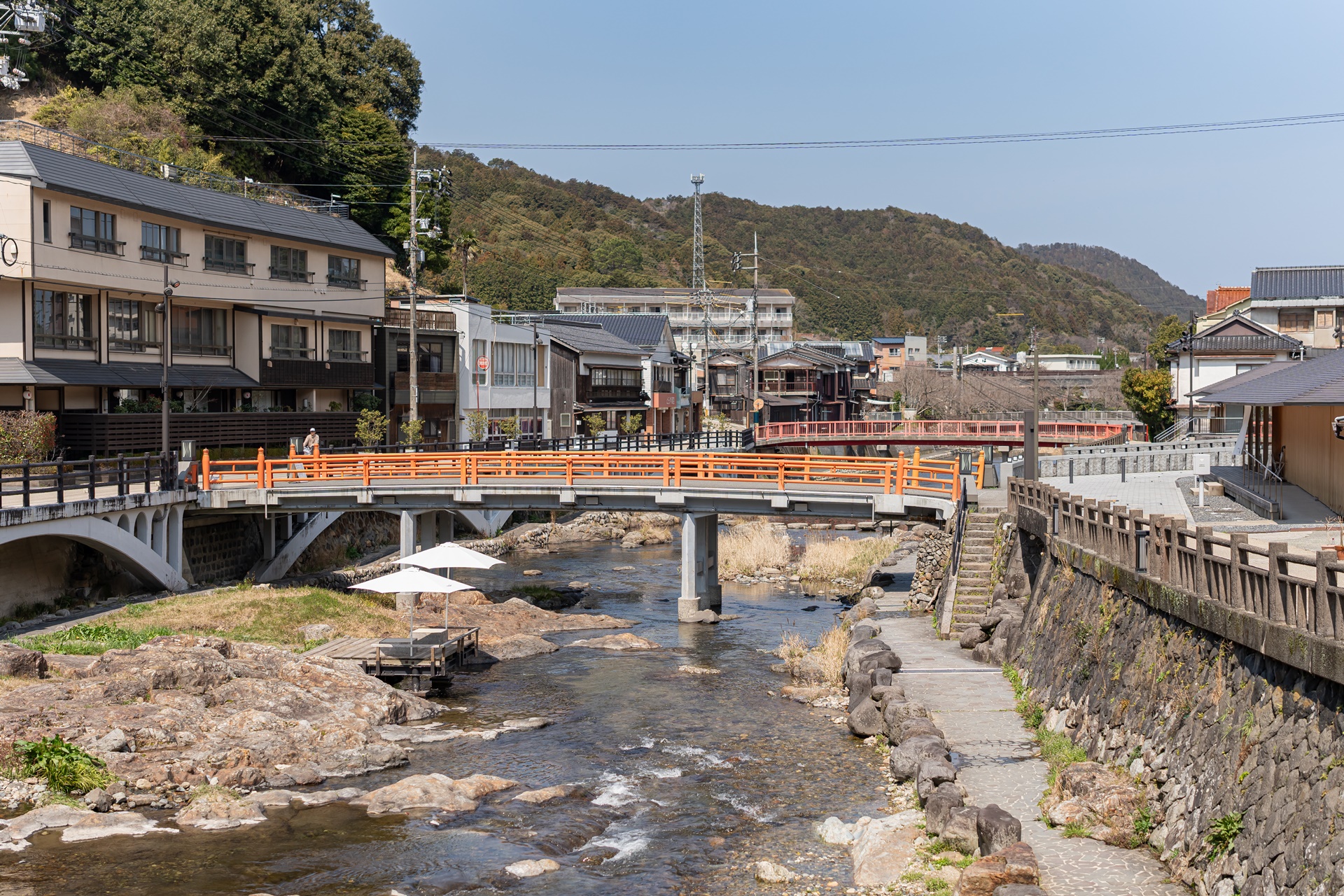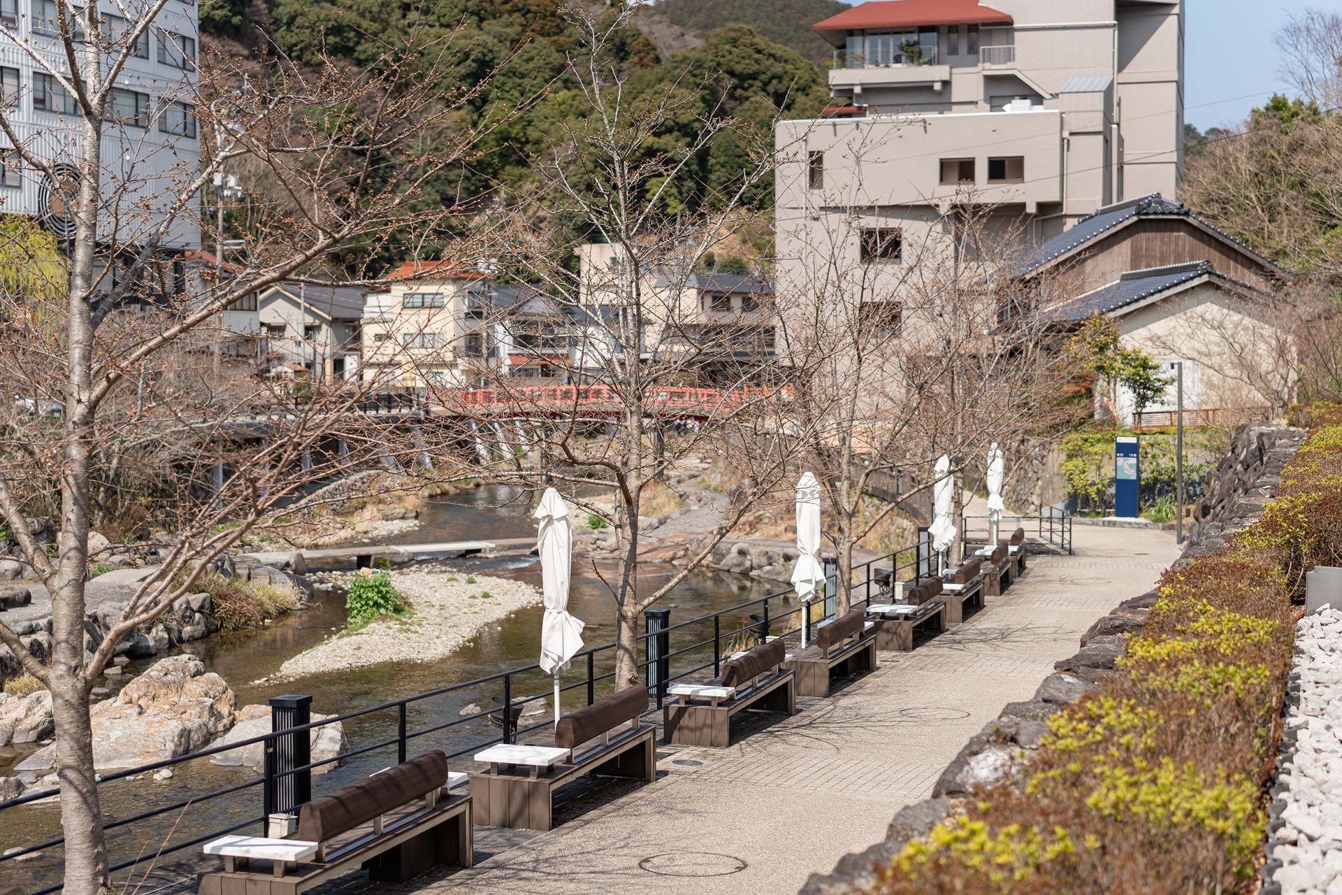 재개발의 물리적 핵심은 마을 중심을 흐르는 오토즈레강을 공간의 주인공으로 만든 것 입니다. 강 위의 테라스, 가와도코는 일본 내에서도 보기 드문 이 공간으로 사람들이 강물 소리를 바로 옆에서 들으며 족욕을 하거나 커피를 마시는 낭만적인 장소로 변모했습니다.