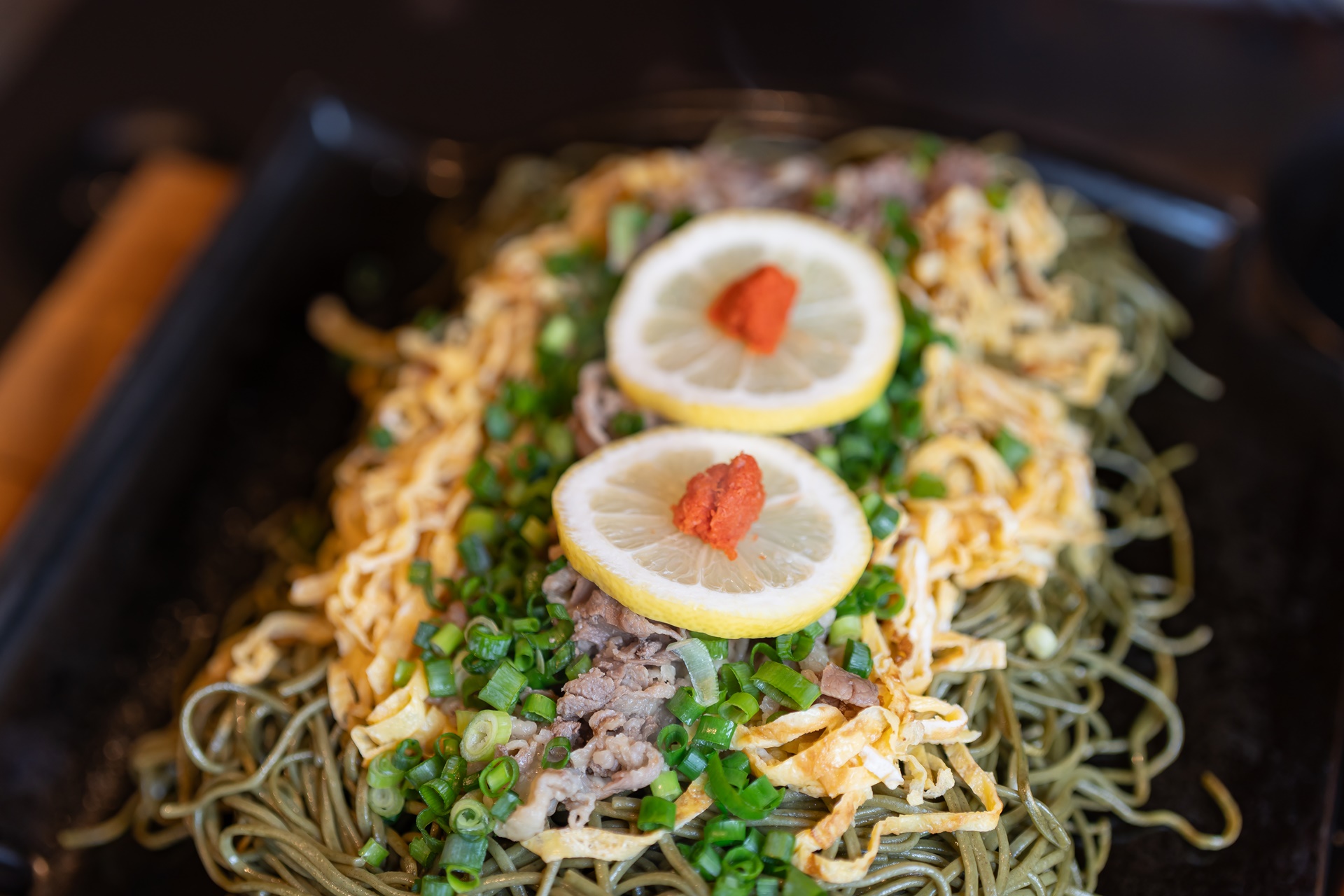 300°C로 달궈진 검은 기왓장 위에서 지글지글 소리를 내며 익어가는 '가와라 소바'는, 은은한 녹차 향을 머금은 차소바(茶そば) 위에 달콤짭짤하게 볶은 소고기와 노란 계란 지단, 알싸한 무즙과 상큼한 레몬을 얹어 내는 야마구치현의 예술적인 향토 요리입니다.