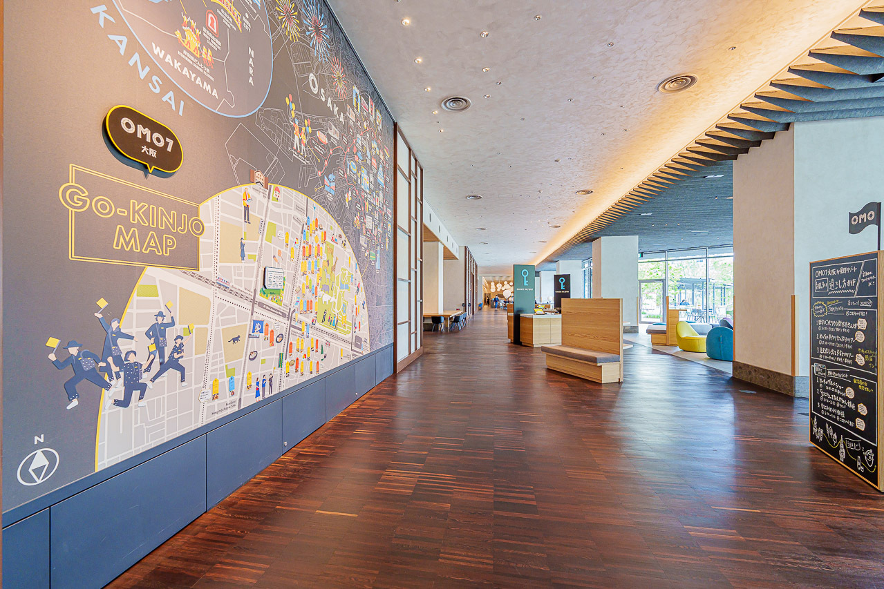 전체 길이 약 85미터, 높이 5미터의 한 면이 유리로 펼쳐진 개방적인 공간인 오모 베이스는 호텔의 로비 겸 공공 공간으로 이용되고 있습니다. 고킨죠맵(ご近所マップ) 공간, 오모 카페 & 바, 오모 다이닝, 도서관 라운지 등의 시설이 있어 독서를 하면서 편히 쉬거나, 오사카의 식문화를 즐길 수 있습니다. 고킨죠맵(ご近所マップ)은 오사카의 지도와 관광명소등 오사카의 정보를 한쪽 벽면에 표시한 넓이 6미터, 높이 4미터의 대형 보드로 호텔의 직원들이 만들어 나가며 주변의 가게나 이웃들이 추천하는 가이드북에 실려 있지 않은 정보들이 게재되어 있습니다. 또한 이 정보를 바탕으로 호텔의 직원과 함께 주변을 둘어보는 투어도 준비되어 있습니다. 마지막으로 정원이 보이는 넓은 창에서는 오사카 계절의 변화를 관찰하며 여유롭게 시간을 보낼 수 있습니다.