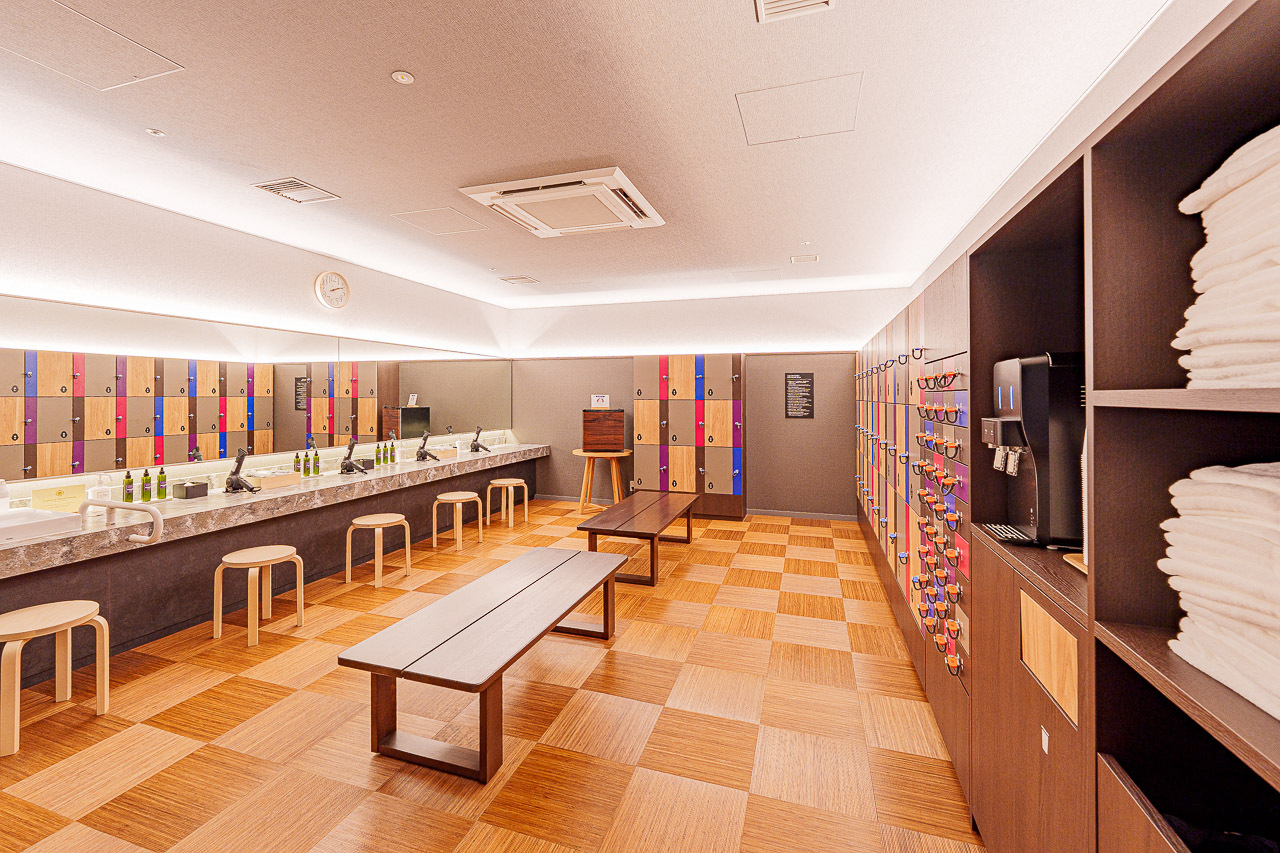 도심정원 미야구린에는 숙박객들이 이용할 수 있는 입욕시설인 유야가 있으며 빛과 그림자를 상징하는 외관이 독특합니다. 상인의 거리로 번창하였던 오사카의 화려한 밝은 모습을 백은색(白銀色, 시로가네이로)으로 표현하고 발전의 상징으로 오사카의 하늘을 덮는 공장의 연기를 은흑색(銀黒色, 긴구로이로)로 표현했습니다. 유야의 천정에는 밖으로 통하는 채광창이 있어 외부의 공기와 소리를 느낄 수 있으며 맑은 날에는 빛이 들어와 욕실내의 증기에 부드럽게 반사되어 몽환적인 분위기를 만들어 냅니다.