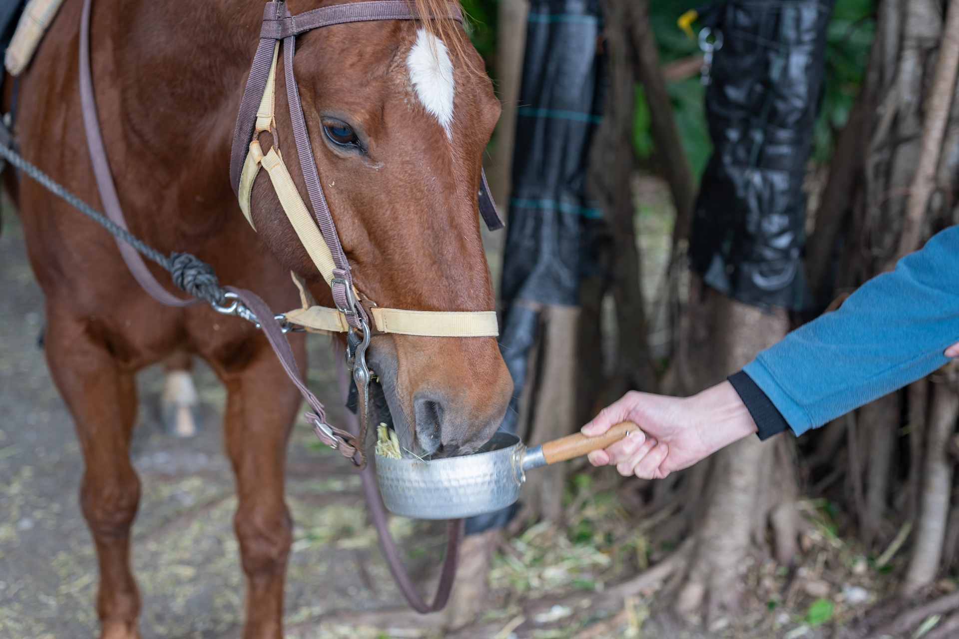 해변을 살짝 둘러보고 다시 원래의 나무 아래로 돌아와 말에게 감사의 먹이를 조금 줍니다.